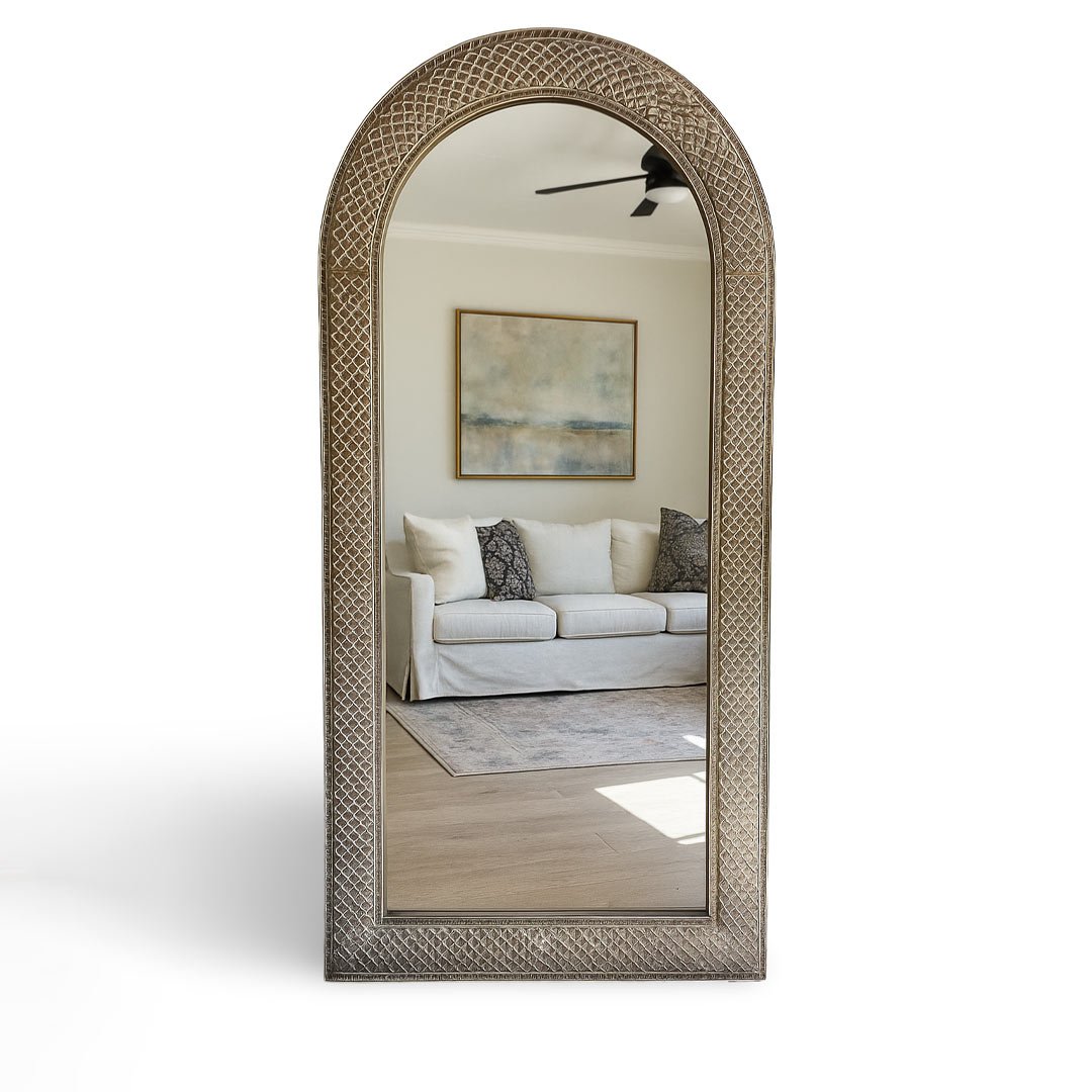 The Archway handcarved Sheesham wood arch mirror introduces a refined sense of scale and elegance to your interiors. From the outset, skilled artisans meticulously hand-carve each mirror from solid Sheesham wood, ensuring durability and exceptional craftsmanship. Moreover, the distressed white finish softly enhances the intricate geometric and floral carvings, creating a timeless balance between classic architecture and vintage charm.