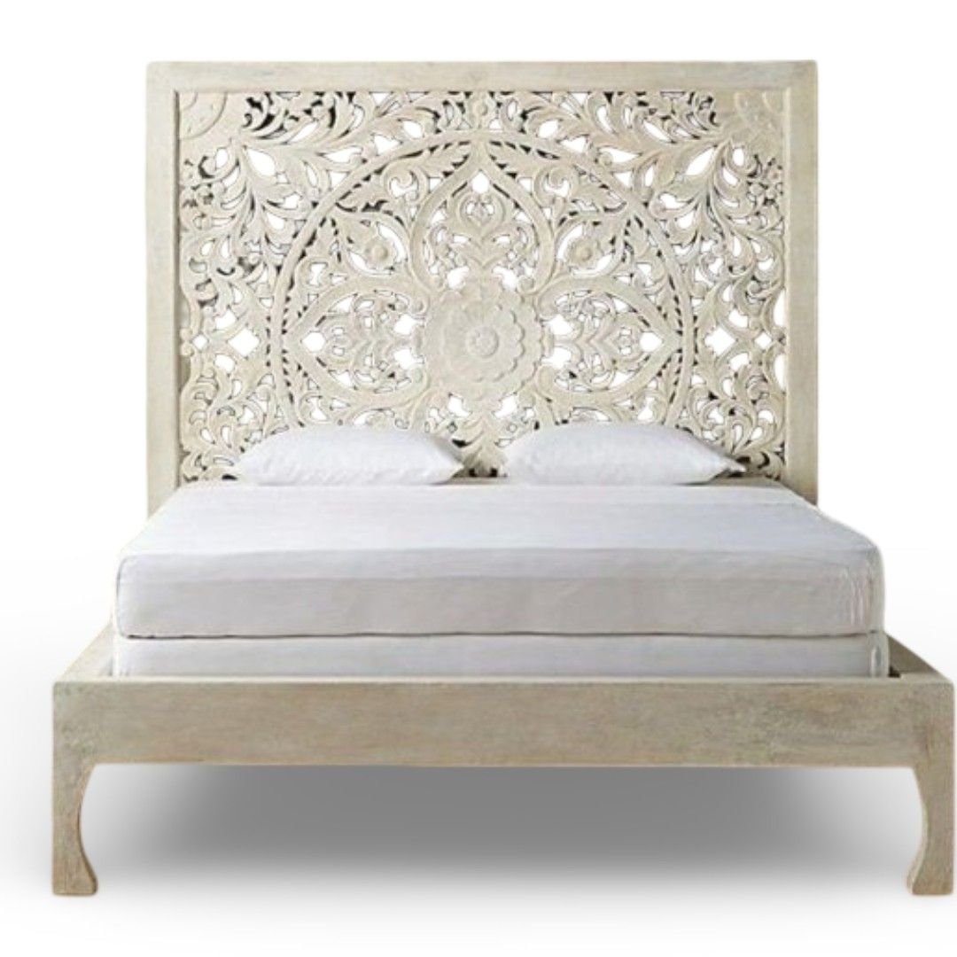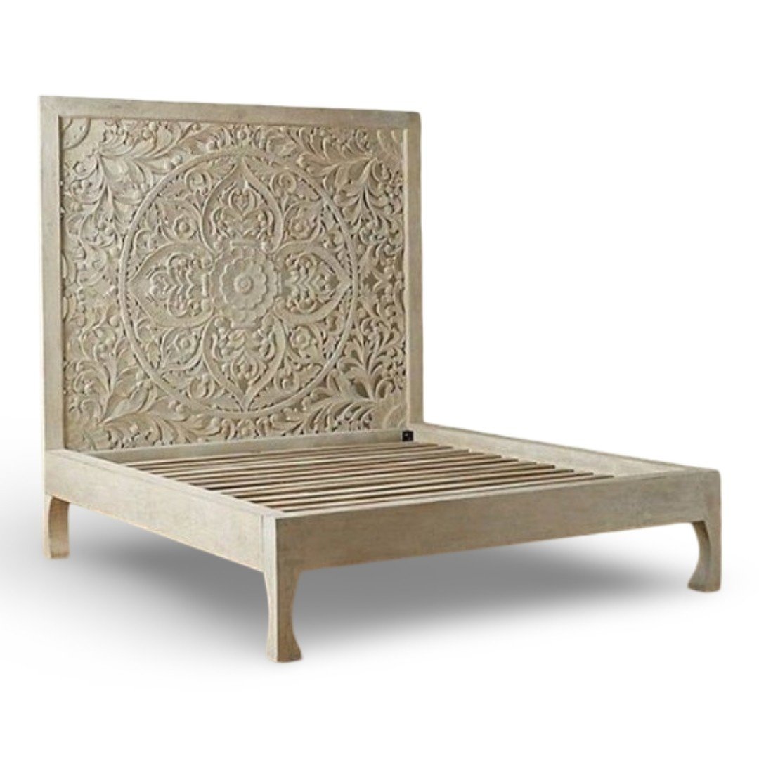 Finished in a soft white distressed tone, the detailed carving stands out gracefully while maintaining a calm and sophisticated look. The solid wooden frame ensures excellent strength and durability, making this handcarved Mango bed a long-lasting investment for your home.