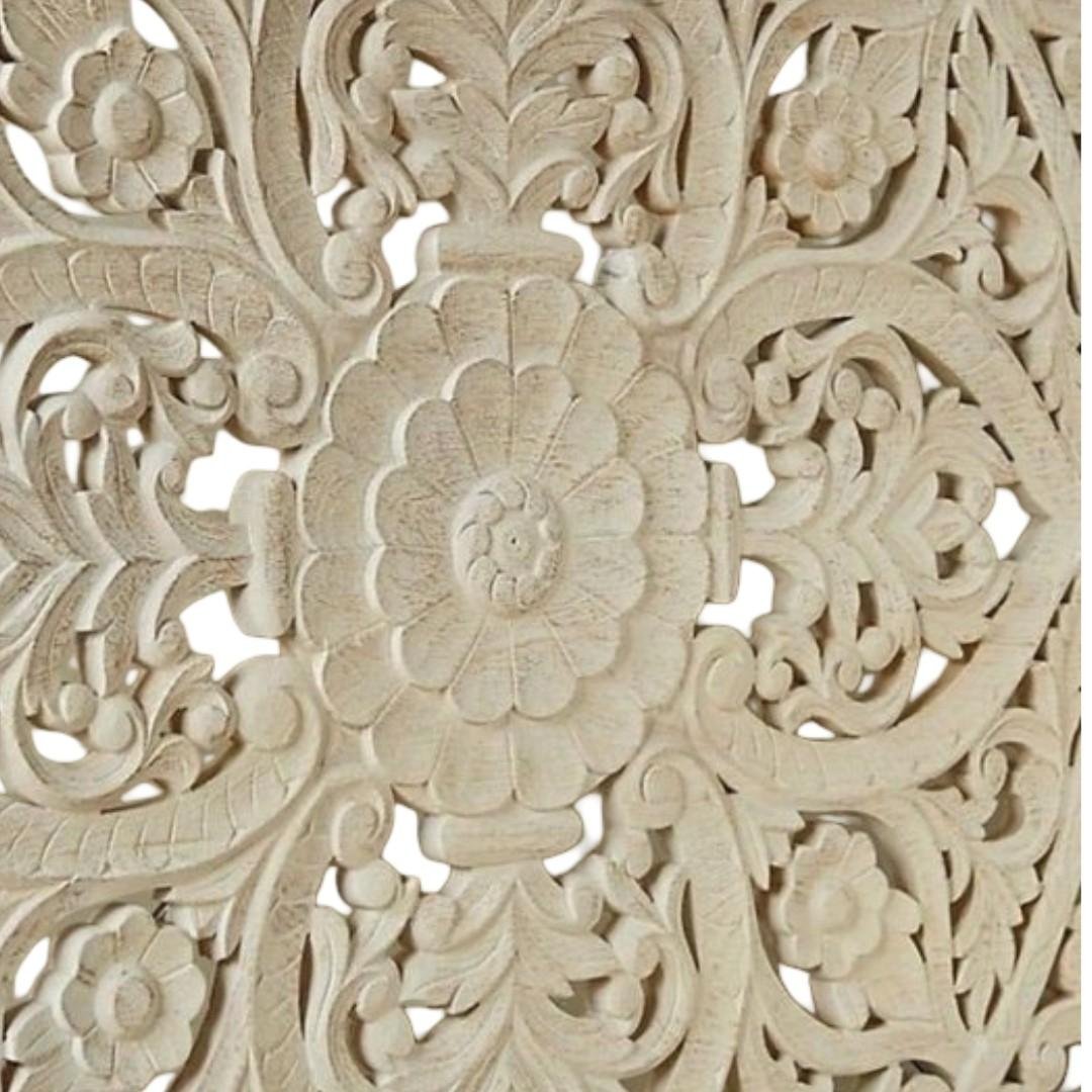 Intricate floral hand-carved headboard |