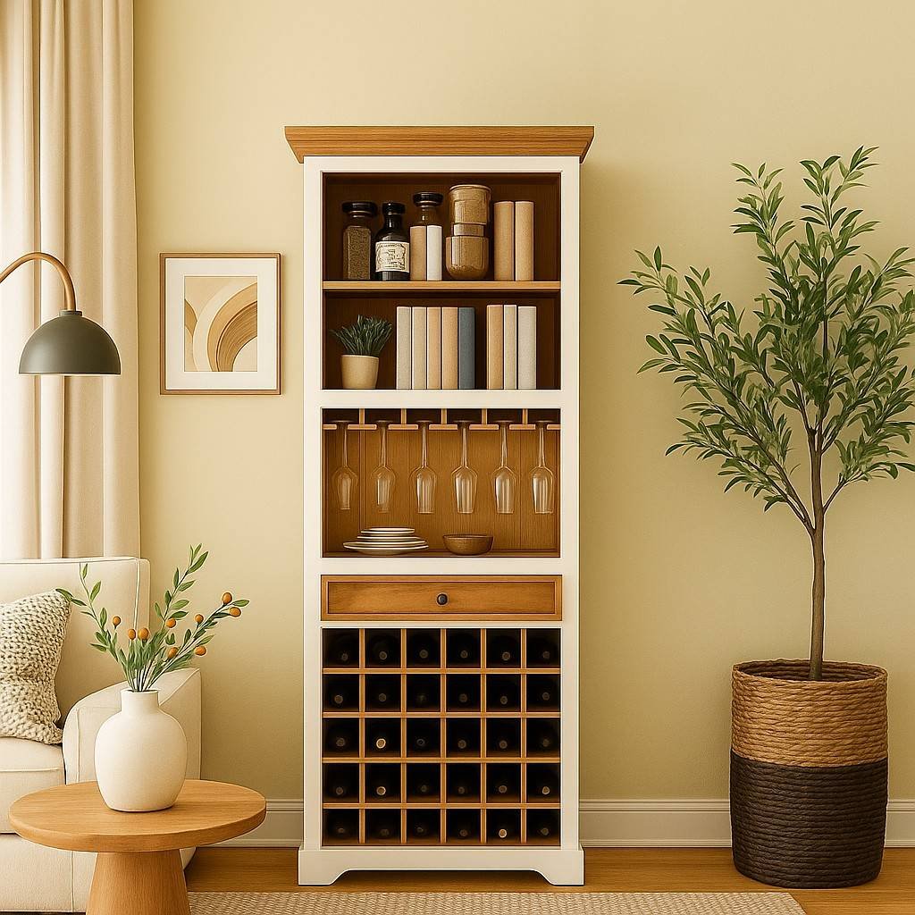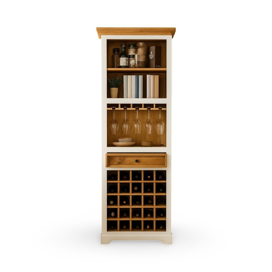 Tall, slender, multi-functional with open shelves, glass rack, drawer, and wine cubbies. |