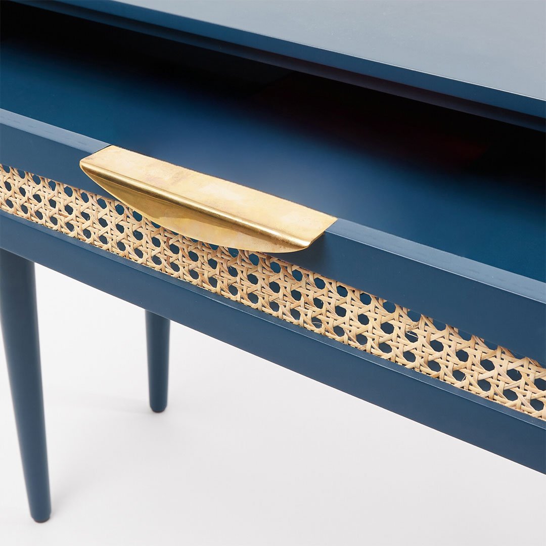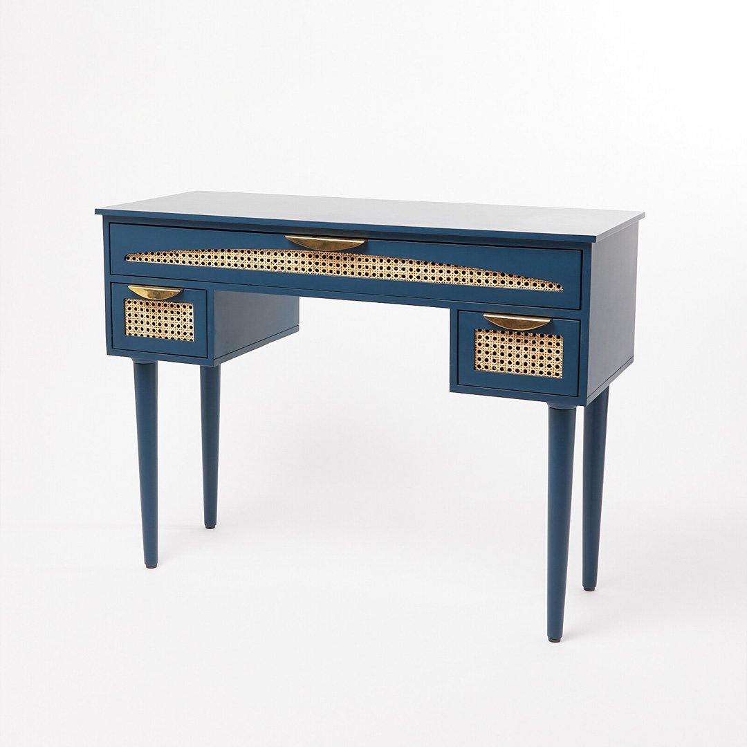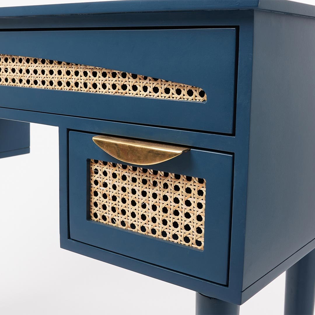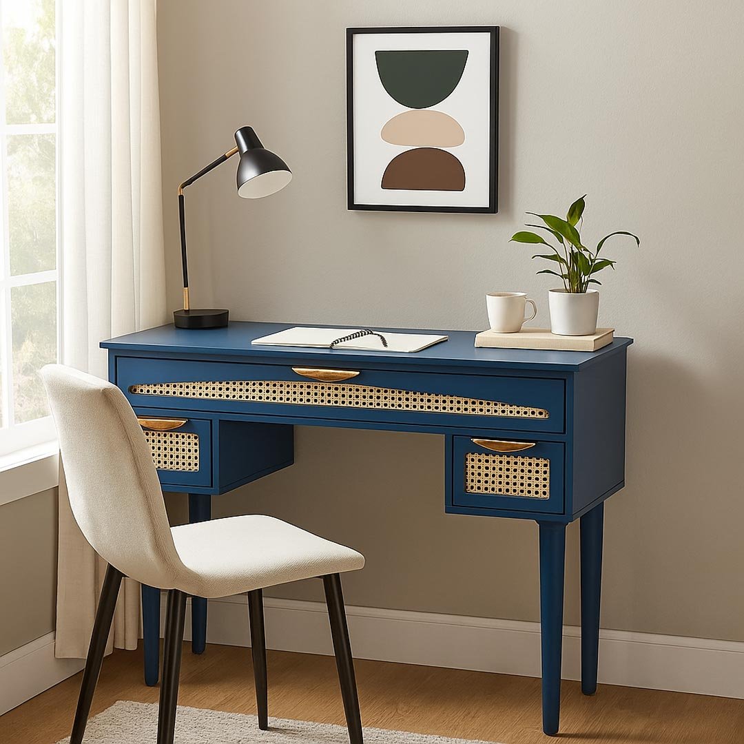 The Blue Harmony rattan study table brings together bold color, handcrafted detailing, and everyday functionality. From the start, skilled artisans craft this table from solid Sheesham wood, ensuring durability and refined craftsmanship. Moreover, the deep blue painted finish creates a striking contrast against the natural rattan drawer fronts, resulting in a balanced blend of tradition and contemporary design.