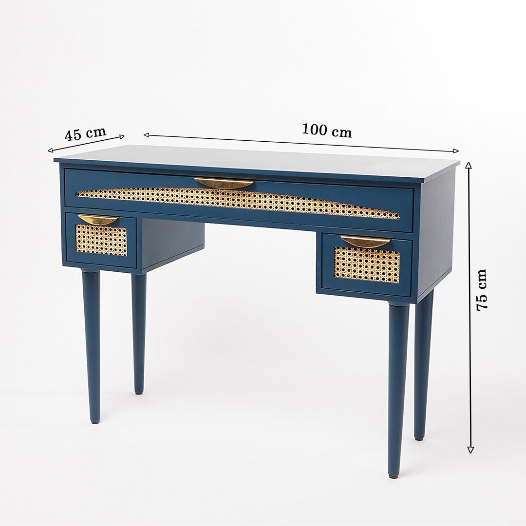 Blue Harmony Sheesham Wood Study Table with Rattan Drawers – Modern Blue Writing Desk- Wooden Slice