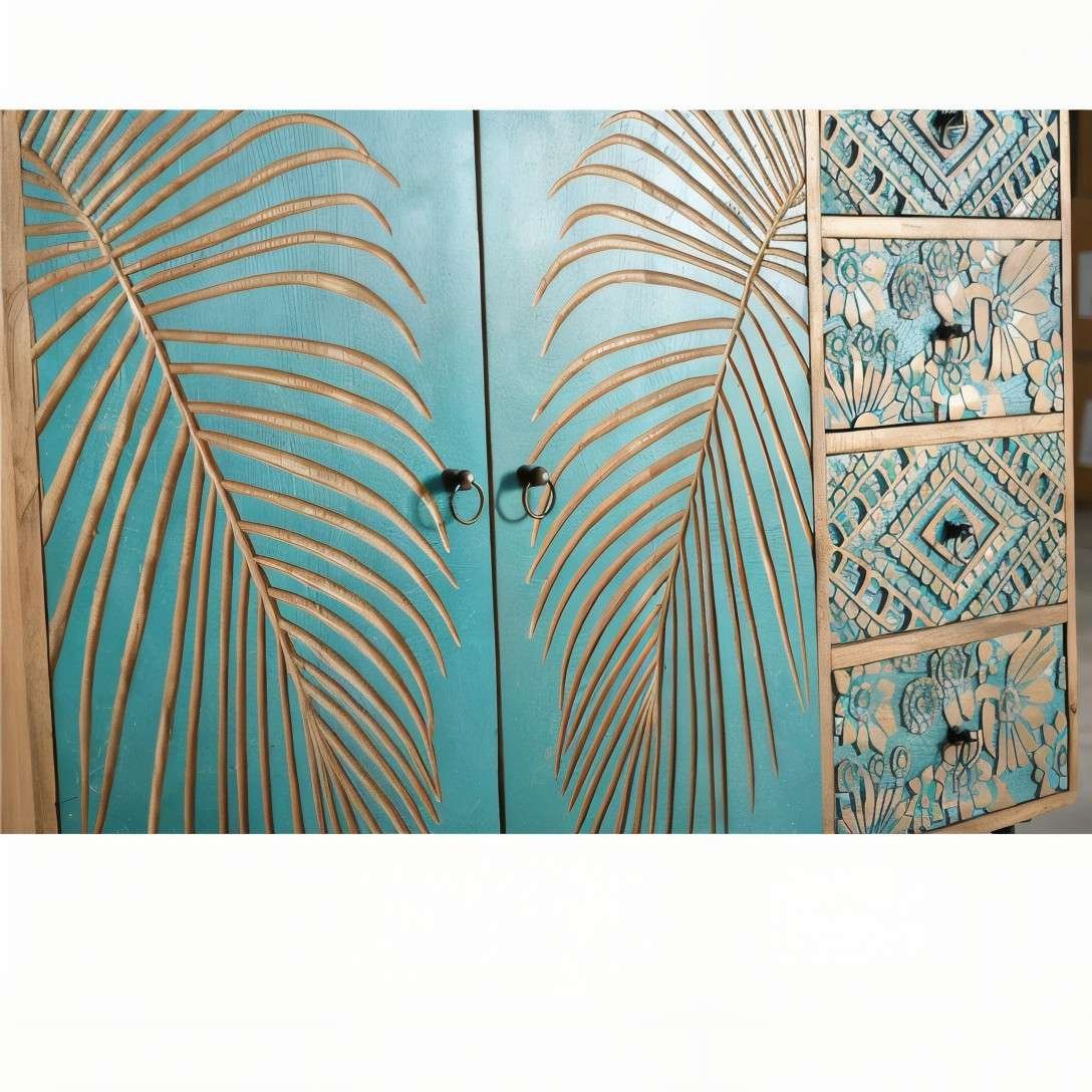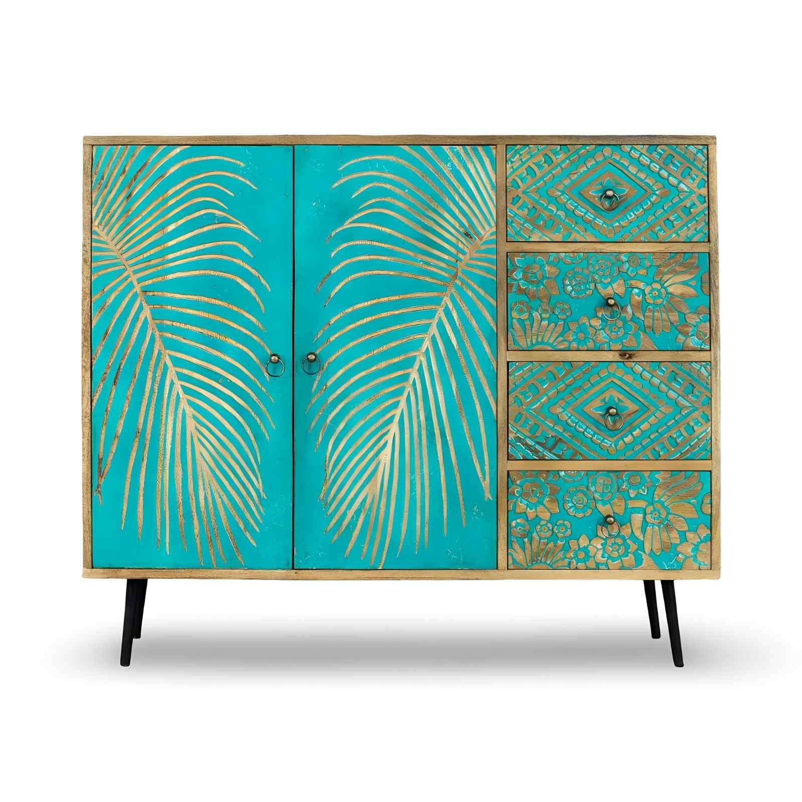 Two central doors featuring large, carved palm leaf motifs painted teal. four drawers with various carved geometric and floral patterns in a distressed teal/natural wood finish. |