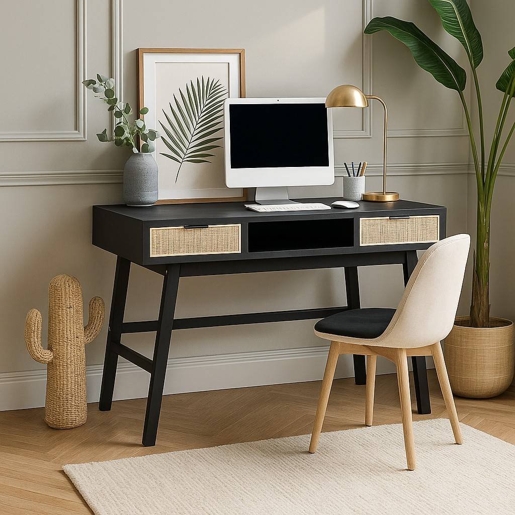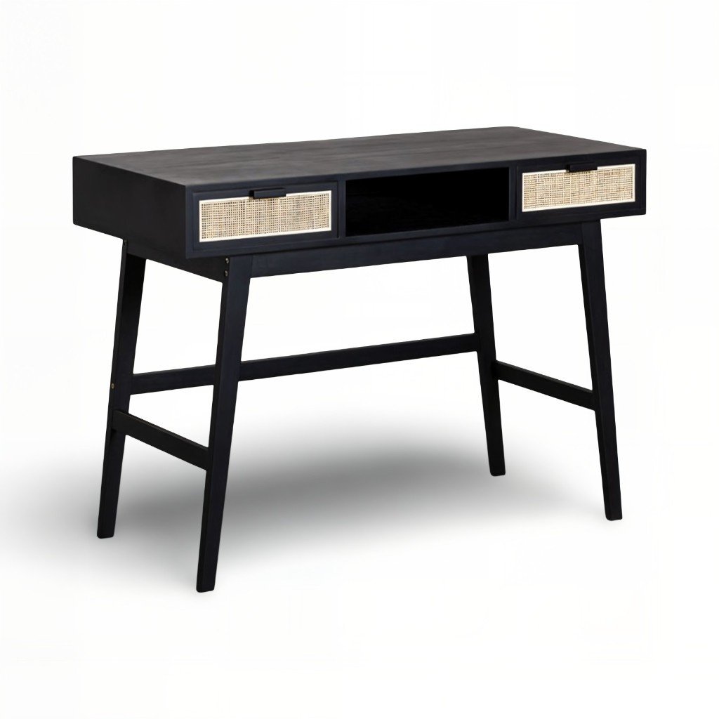 The Braintree rattan cane study desk merges minimalist design with timeless craftsmanship. Skilled artisans at Wooden Slice handcraft each desk from solid Mango wood. The bold black finish contrasts beautifully with natural rattan drawer fronts, giving the desk a modern yet organic aesthetic.