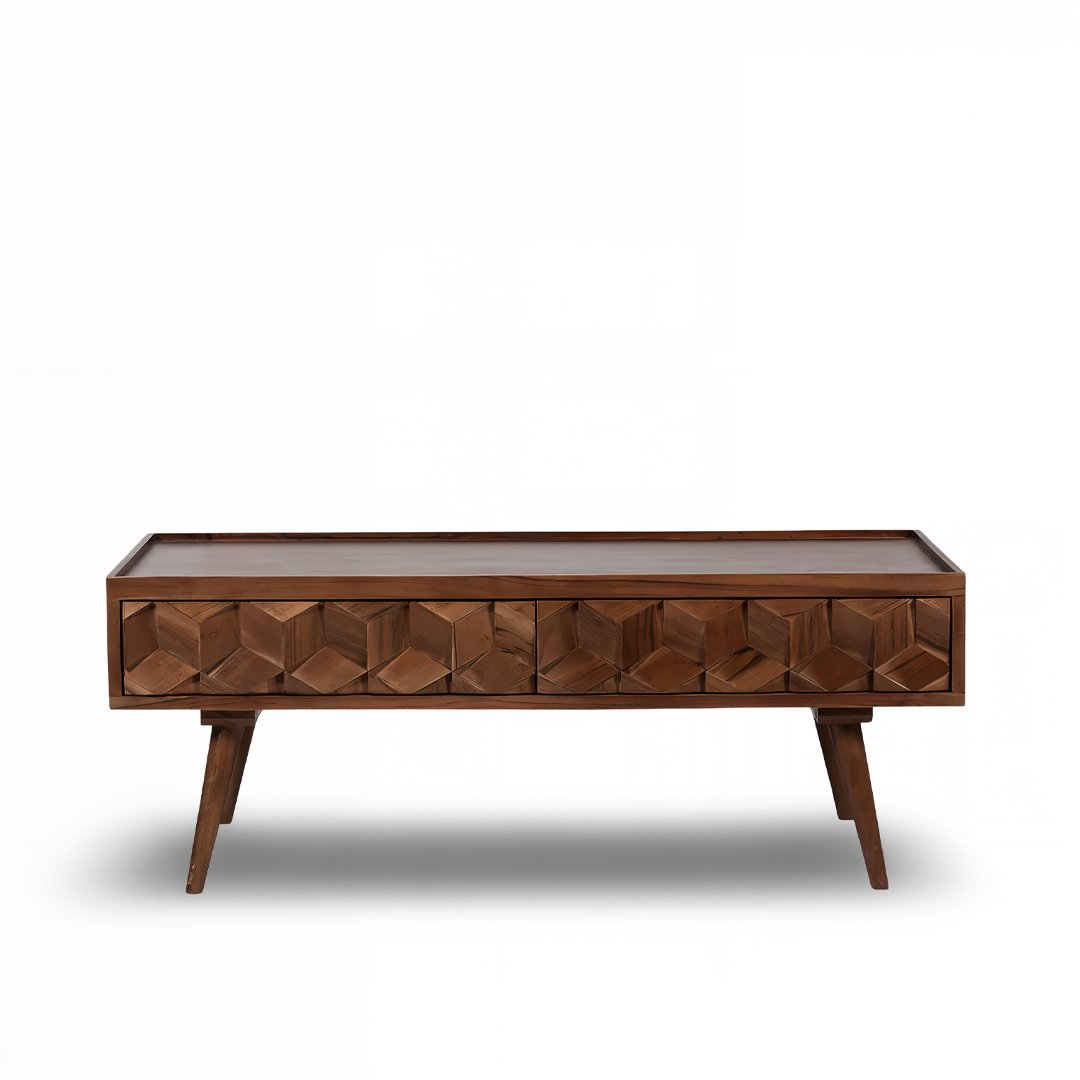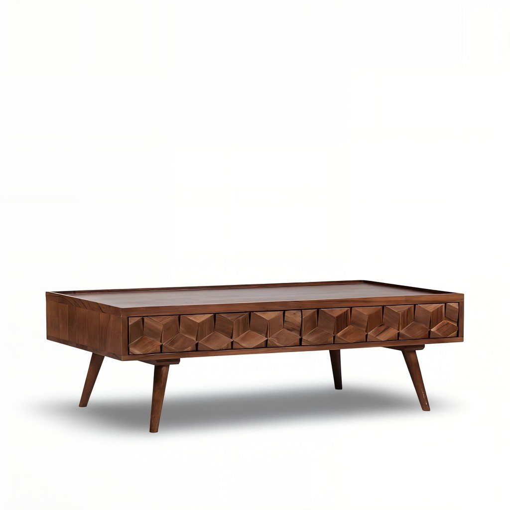 Elevate your living space with the rich character and modern elegance of the Brewlyn Coffee Table from Wooden Slice. Designed for those who appreciate the balance of artistry and functionality, Brewlyn is a handcrafted masterpiece made from premium solid Sheesham wood and defined by its intricate 3D geometric front pattern.