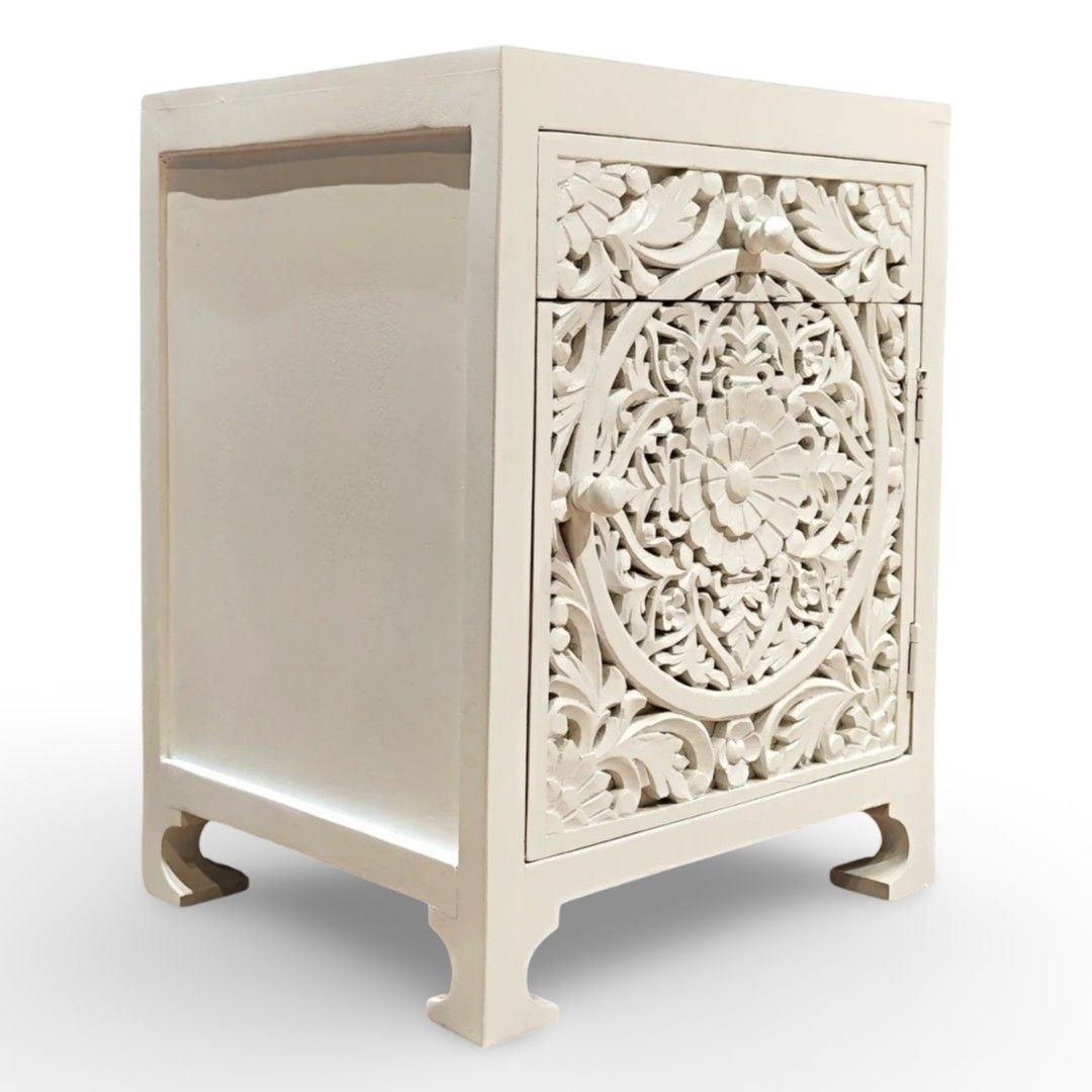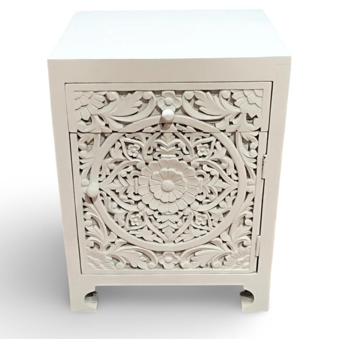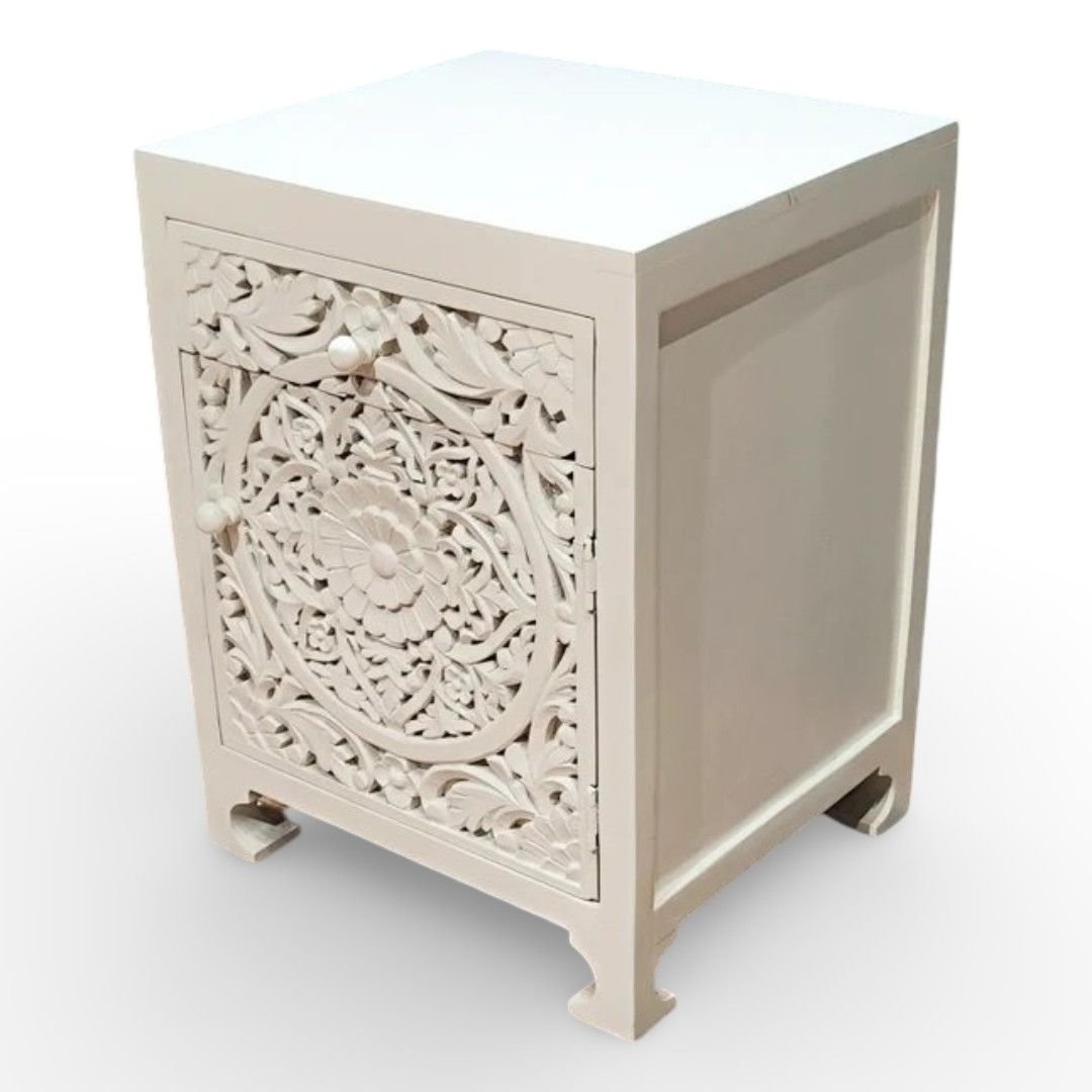 IvoryRosette Carved Bedside Table in Solid Mango Wood with White Polish | Handcrafted Wooden Bedside Cabinet- Wooden Slice