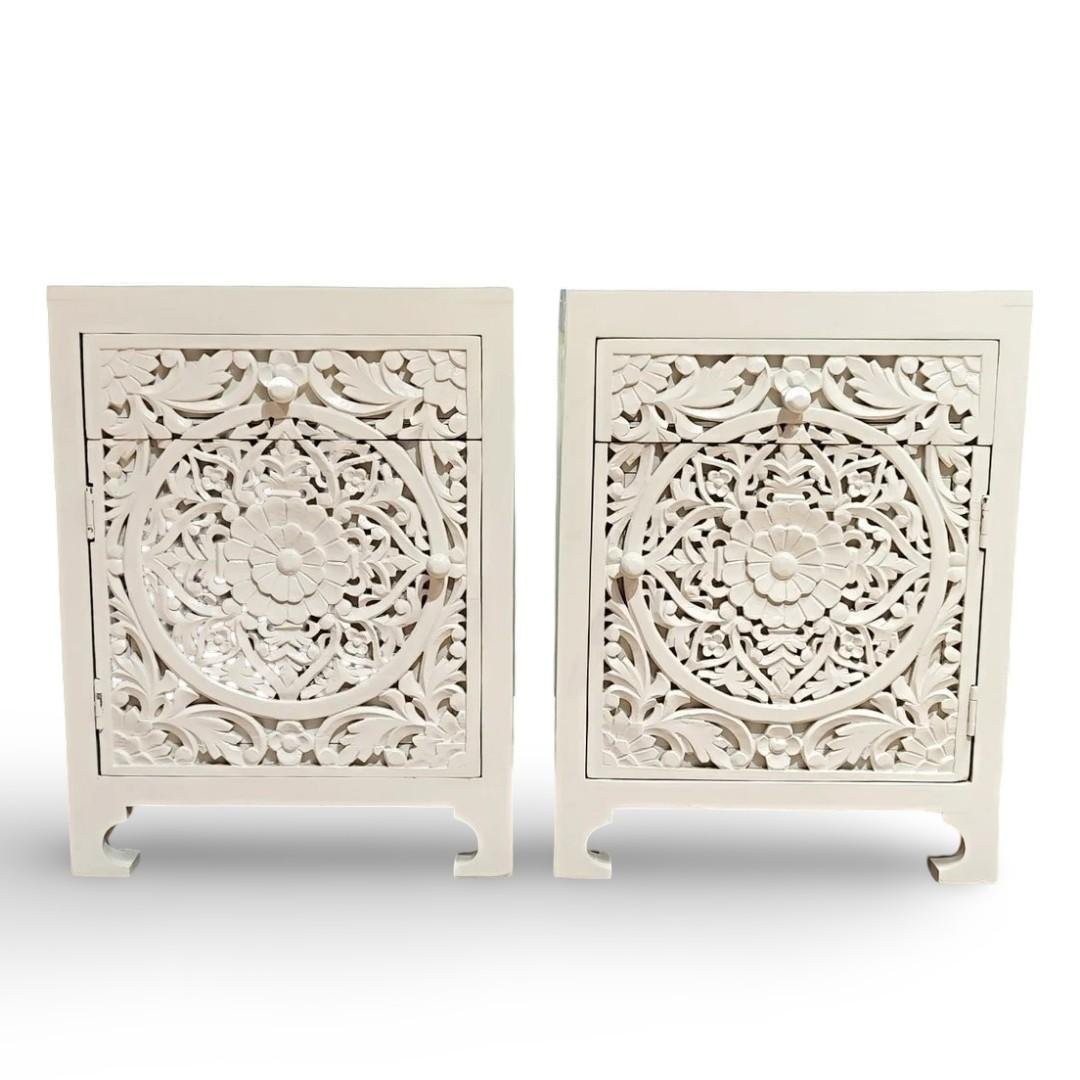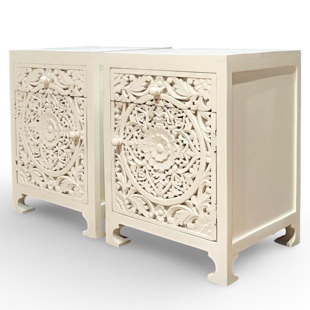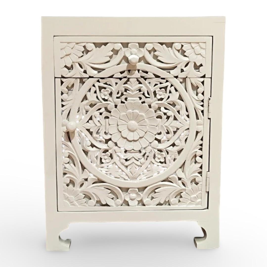 IvoryRosette Carved Bedside Table in Solid Mango Wood with White Polish | Handcrafted Wooden Bedside Cabinet- Wooden Slice