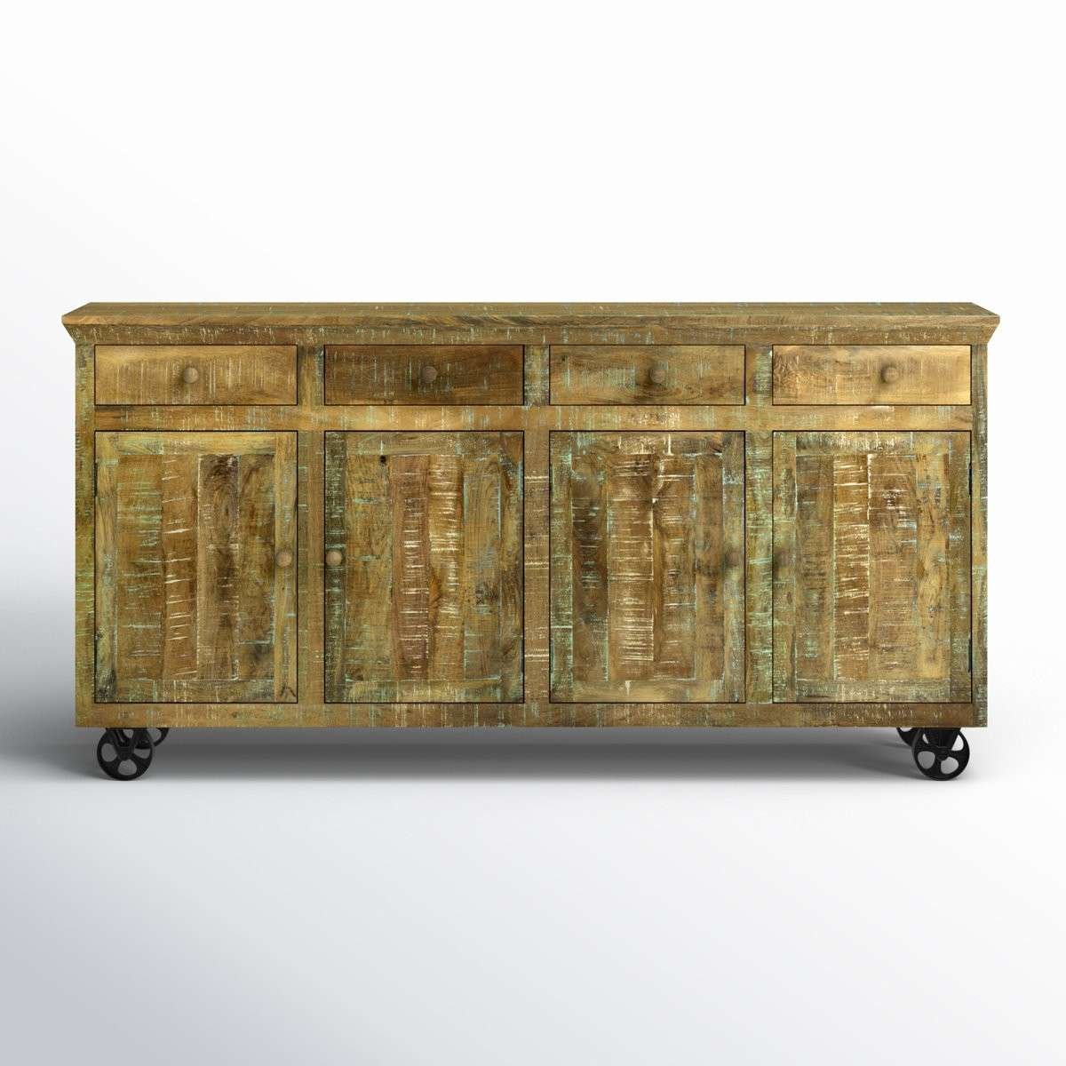 Vintage-inspired distressed finish console table with solid wood body and industrial wheels. |