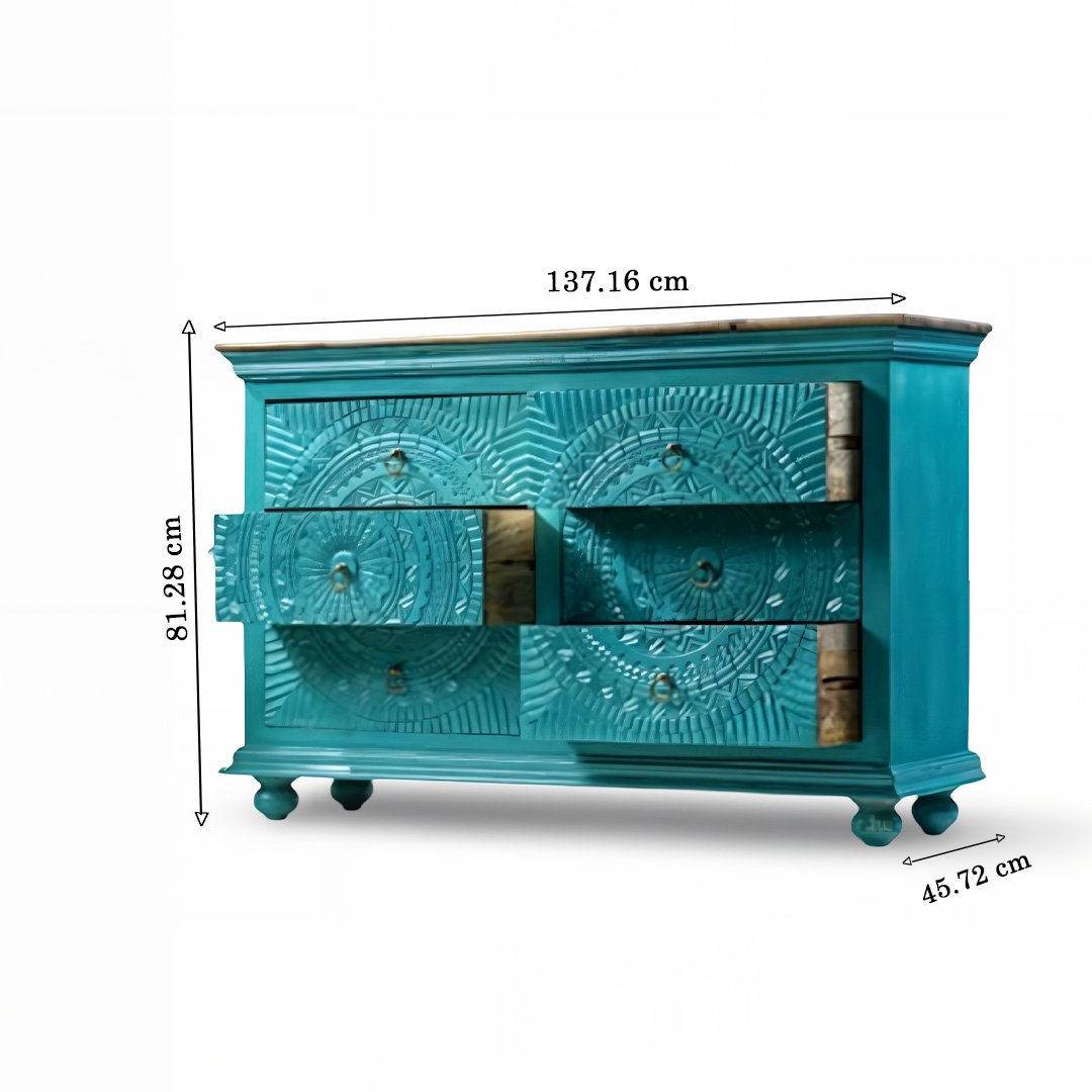 Drawzi Hand-Carved Blue Mango Wood Console Table – Bohemian Chest Of Drawer- Wooden Slice