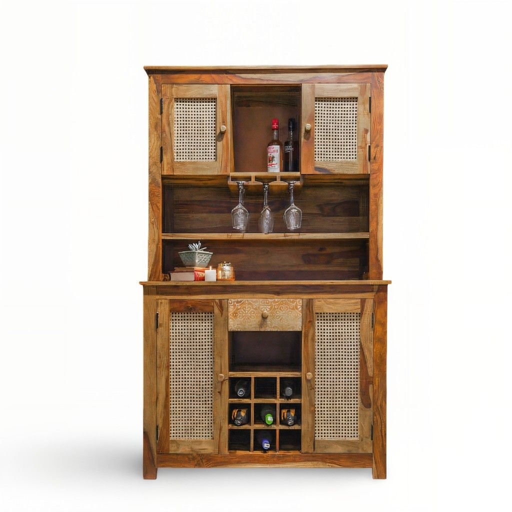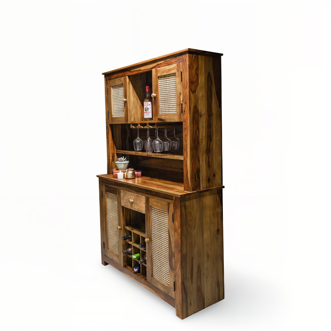 In addition, the freestanding design allows flexible placement without wall mounting. Whether styled in a rustic, bohemian, or modern interior, this Sheesham wood cane bar cabinet adapts seamlessly to your space.