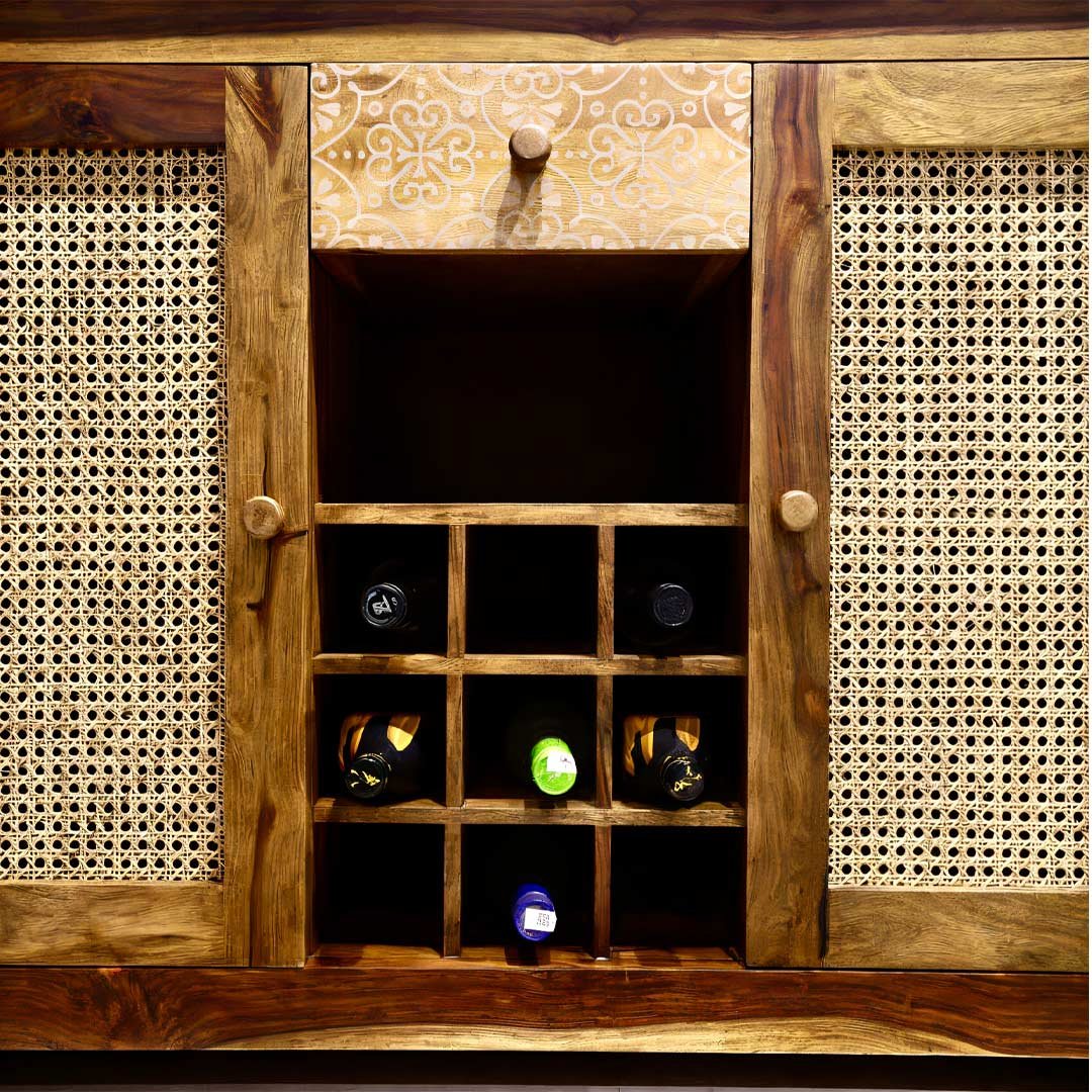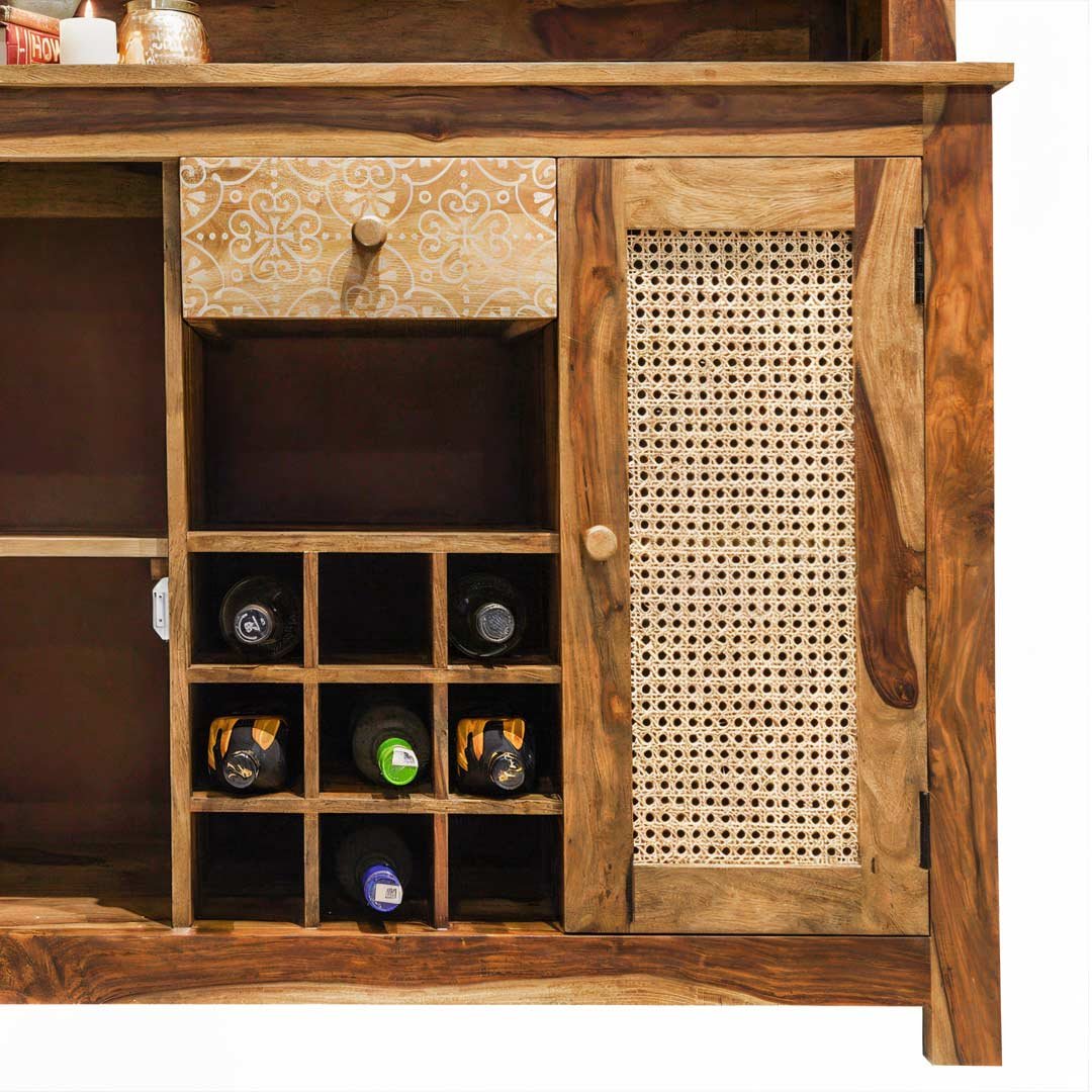 Elevate your hosting game with the Driftbar Sheesham Wood Cane Bar Cabinet, a stunning handcrafted creation by Wooden Slice that blends rustic charm with modern functionality. Designed to make a statement, this cane bar cabinet enhances both living and dining spaces with ease.