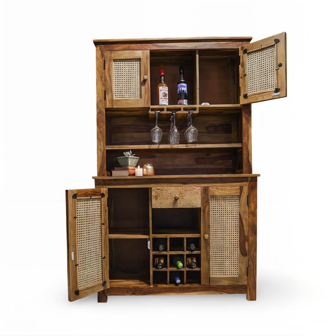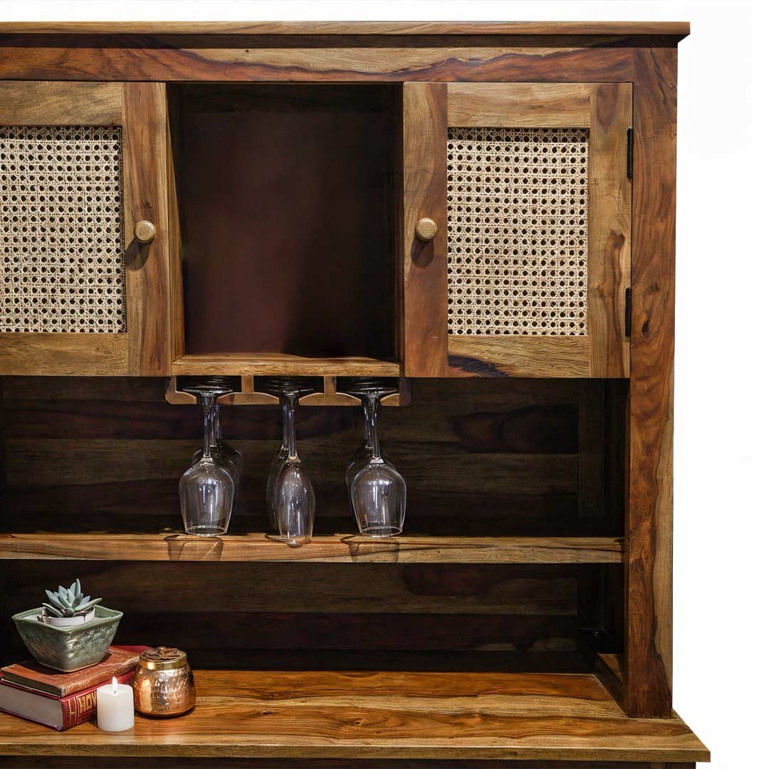 Expertly handcrafted from 100% solid Sheesham wood, this wooden bar cabinet showcases rich grain patterns highlighted by a warm honey finish. Moreover, the handwoven natural cane doors add texture and artisanal character, creating a perfect balance between traditional craftsmanship and contemporary style.