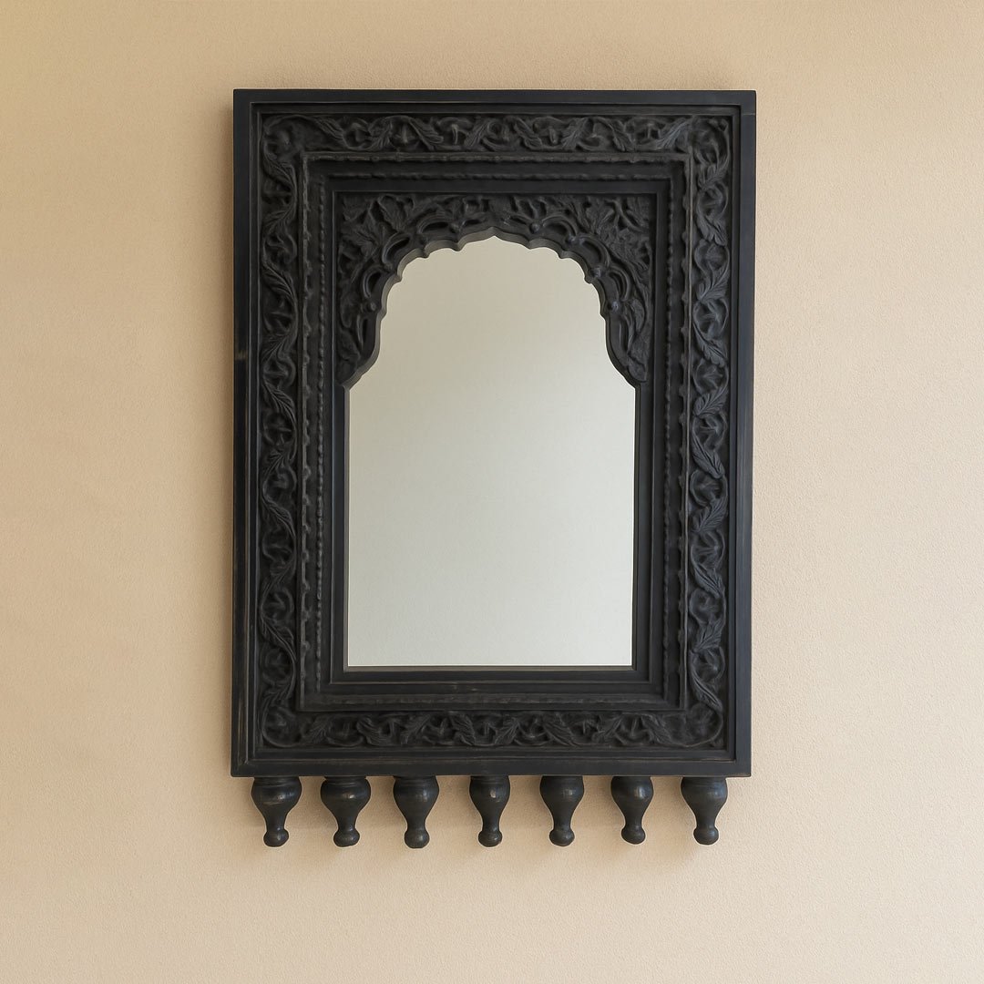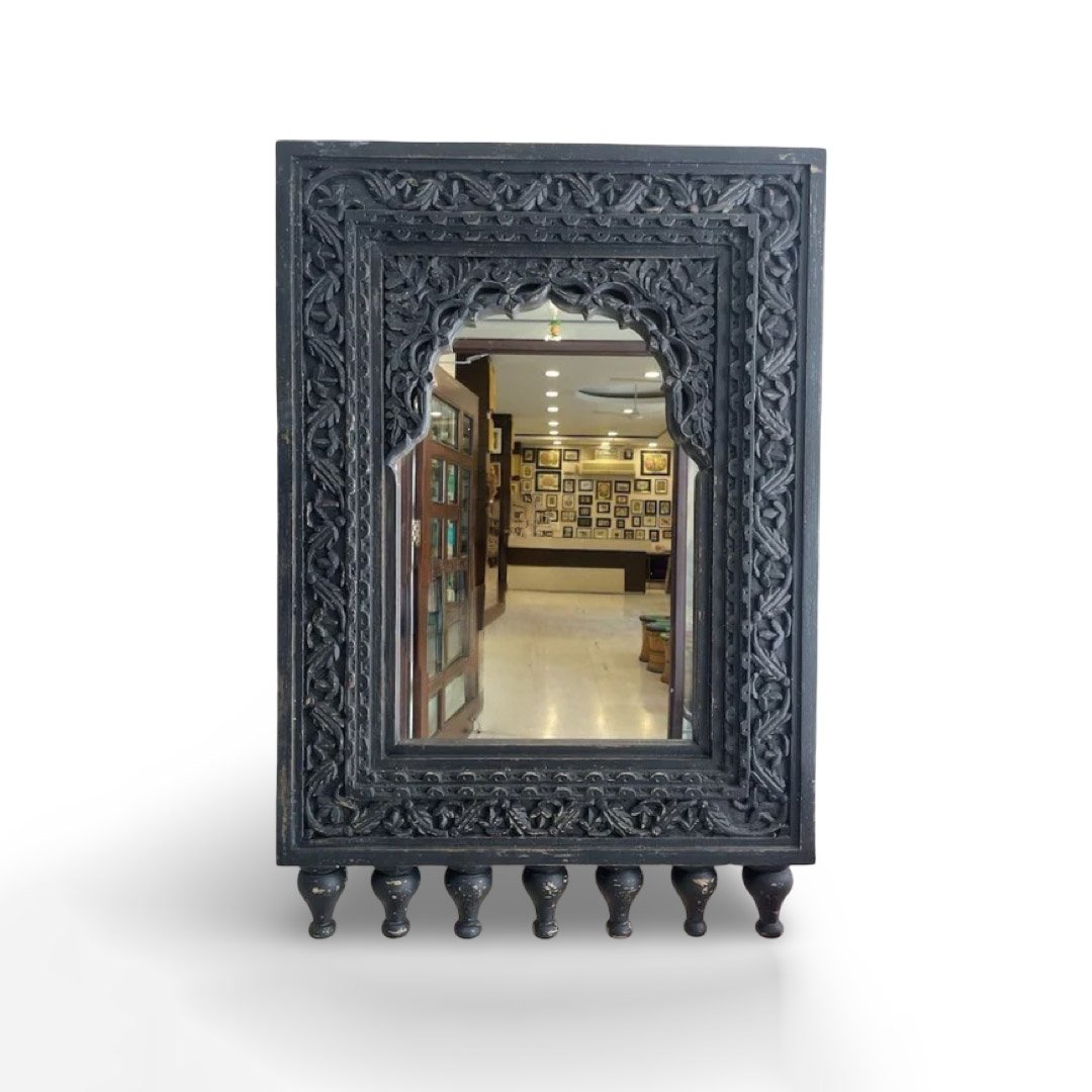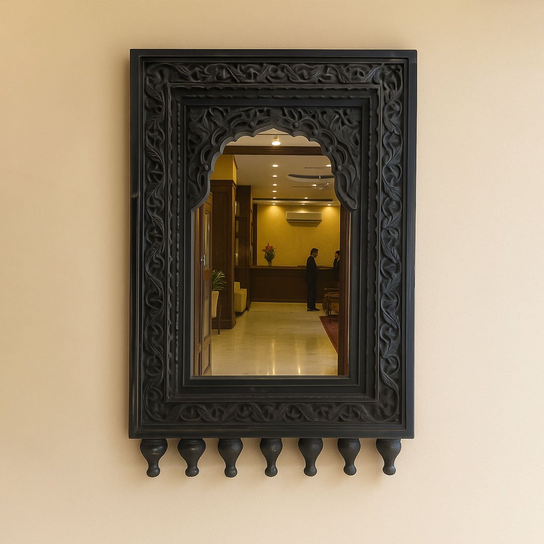 The Ebony Arch Jharokha handcarved wall mirror is a celebration of traditional craftsmanship and timeless design. Expertly handcrafted from premium mango wood, this mirror features an elegant arched silhouette inspired by classic Jharokha architecture. The intricate carvings and rich ebony finish create a striking vintage presence that enhances both traditional and contemporary interiors.