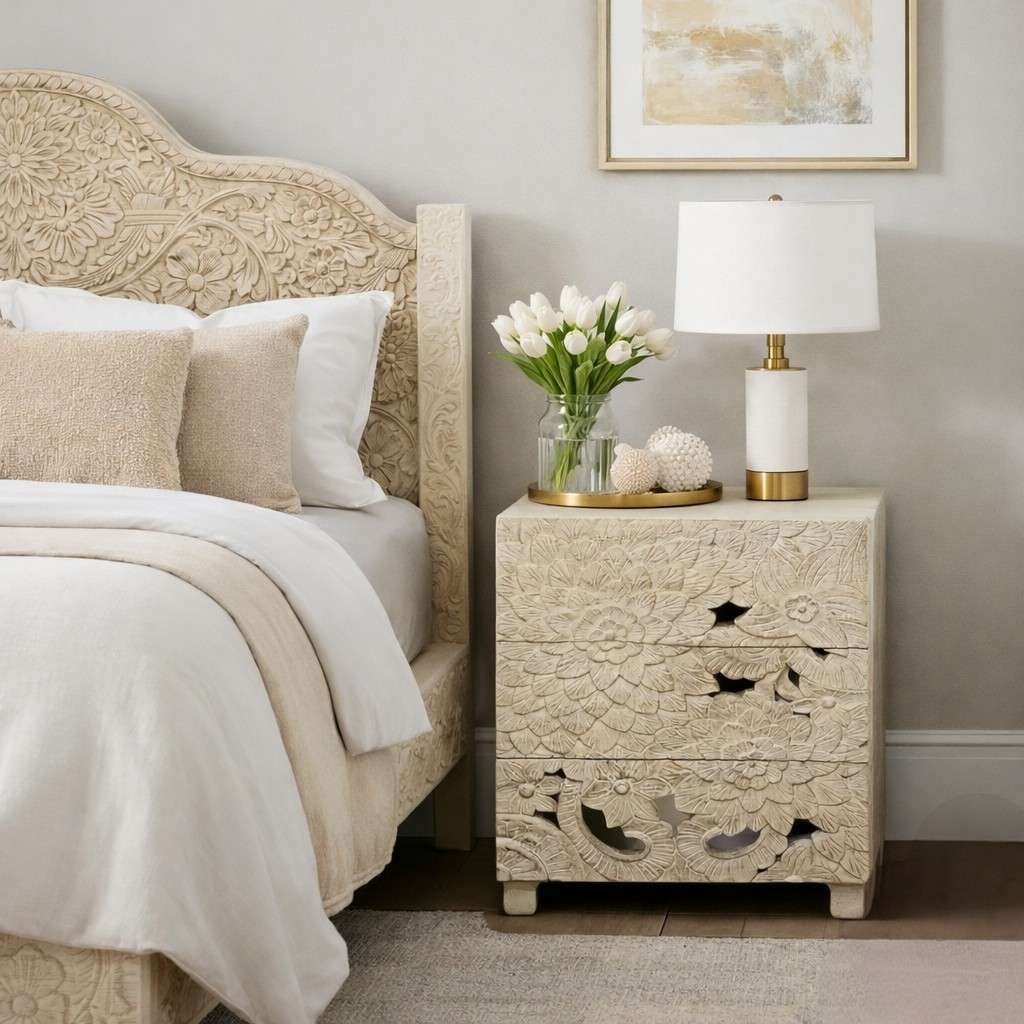 Designed with three spacious drawers, this bedside table offers ample storage for books, essentials, and personal items while keeping your bedroom organized and clutter-free. The soft whitewashed finish enhances the depth of the carvings, making each piece visually striking and truly one of a kind.