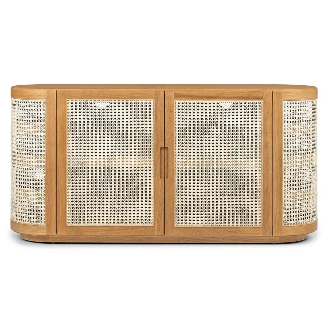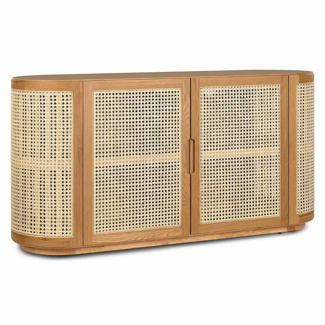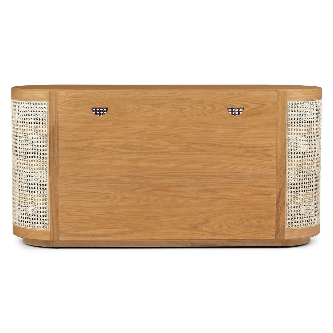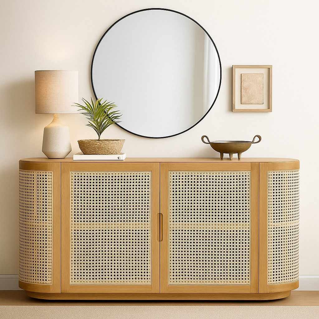 The Grivano console combines handwoven cane panels with smooth wooden framing, creating a balance of organic warmth and refined design. With its generous storage space, you can neatly organize dinnerware, linens, or everyday essentials, while the wide tabletop is ideal for displaying décor accents, plants, or a table lamp to elevate your home styling.