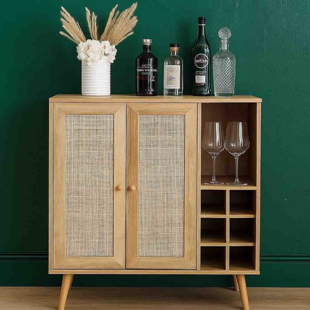 The cane bar unit includes a built-in wine rack for secure bottle storage. It also offers an open display shelf for décor or frequently used glassware. Furthermore, spacious enclosed compartments neatly organize bar tools and accessories.