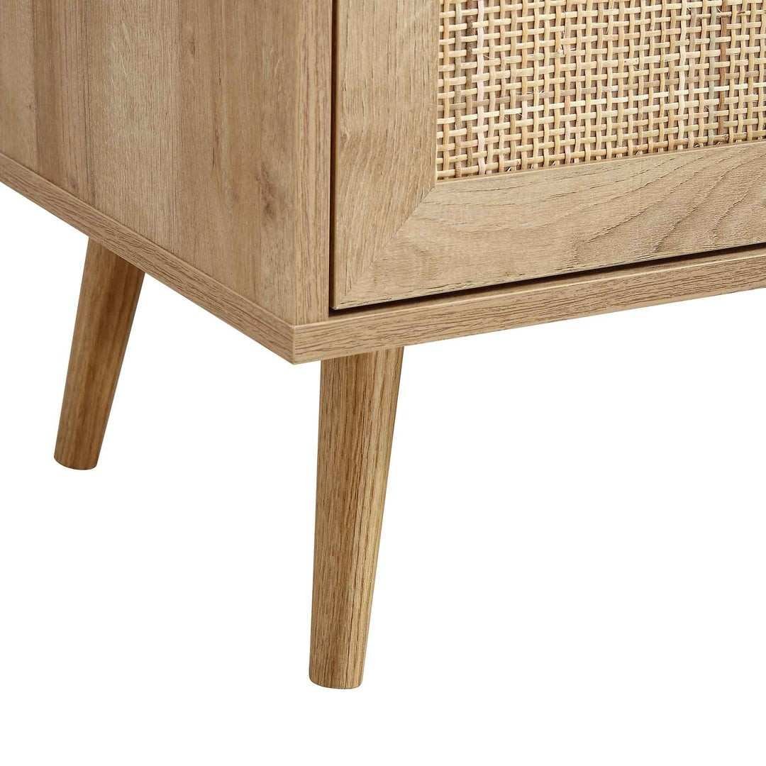 Natural wood finish with handwoven cane doors. |