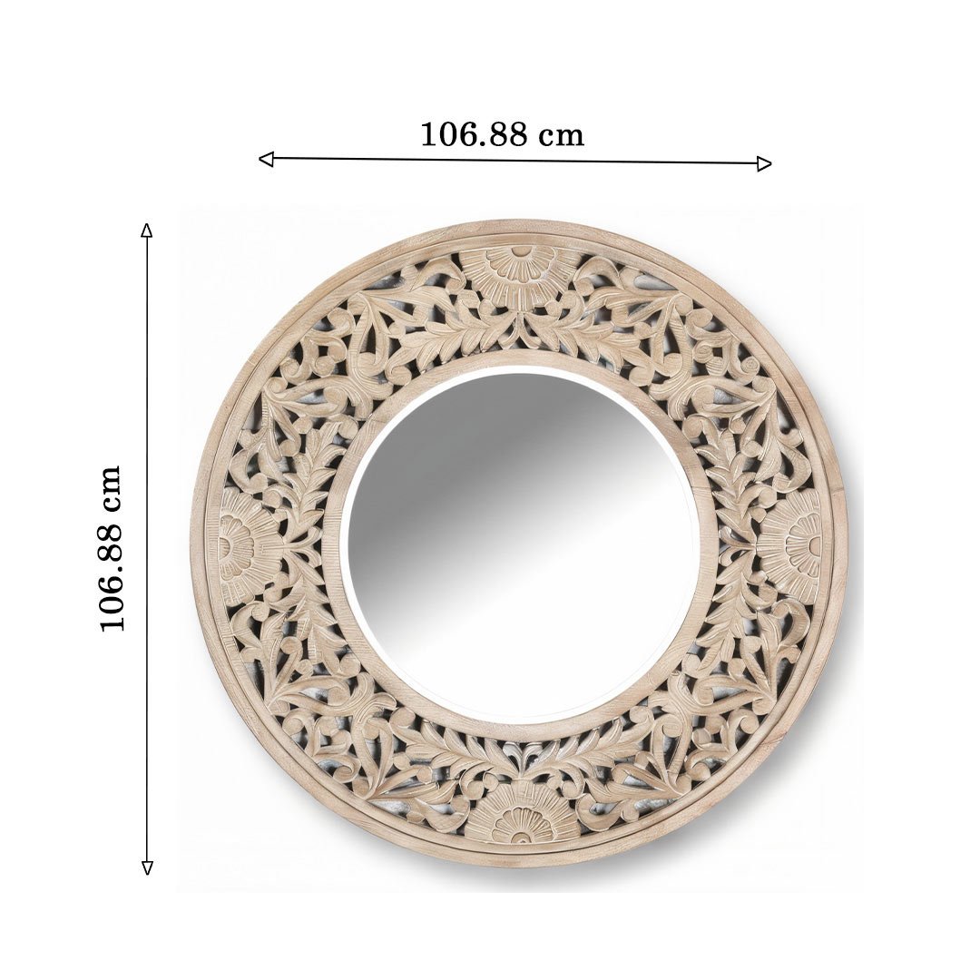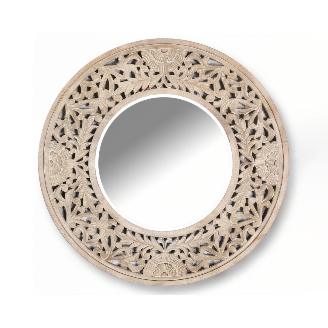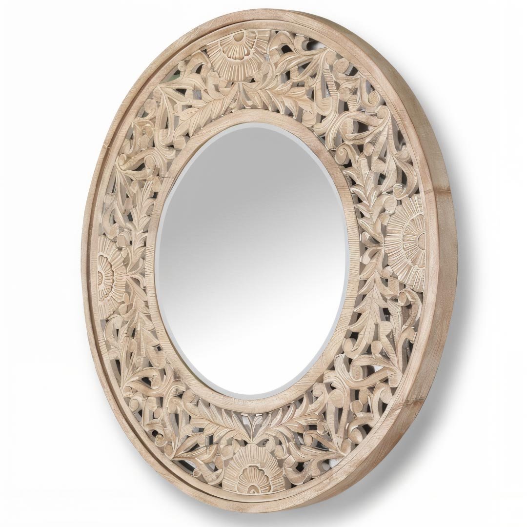 The Luminara handcrafted wooden round mirror is an elegant expression of artisanal craftsmanship. Carefully carved from premium mango wood, this mirror features delicate floral motifs that accentuate the wood’s natural grain and texture. Its warm beige finish brings softness and sophistication, making it an ideal addition to both vintage and contemporary interiors.