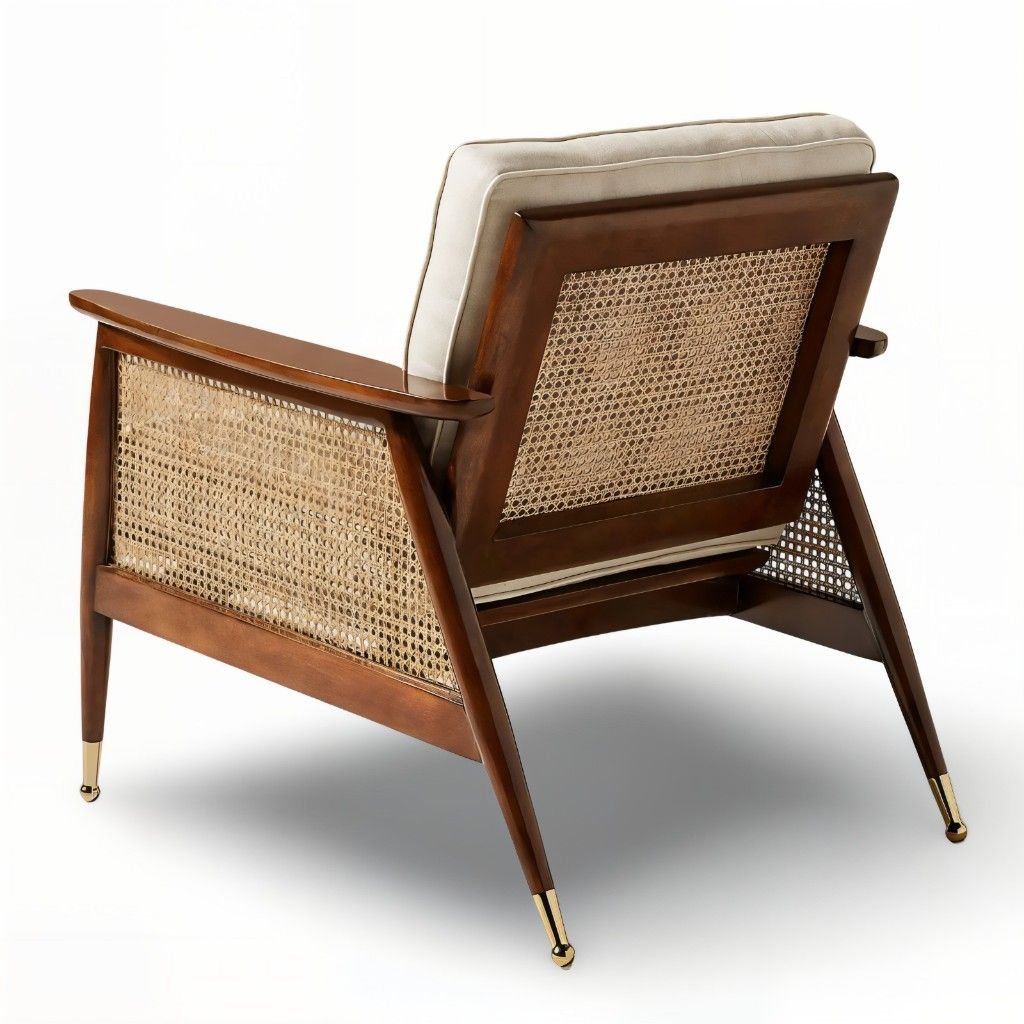 Introduce elevated comfort and timeless craftsmanship to your home with the Lusso Armchair — a premium sheesham wood rattan cane chair made for modern interiors. This handcrafted piece uses solid Sheesham wood, natural rattan cane, and premium cushioned upholstery. Its mid-century modern silhouette features an open wooden frame, a button-tufted back, and tapered legs. The design adds charm and sophistication to any living space.