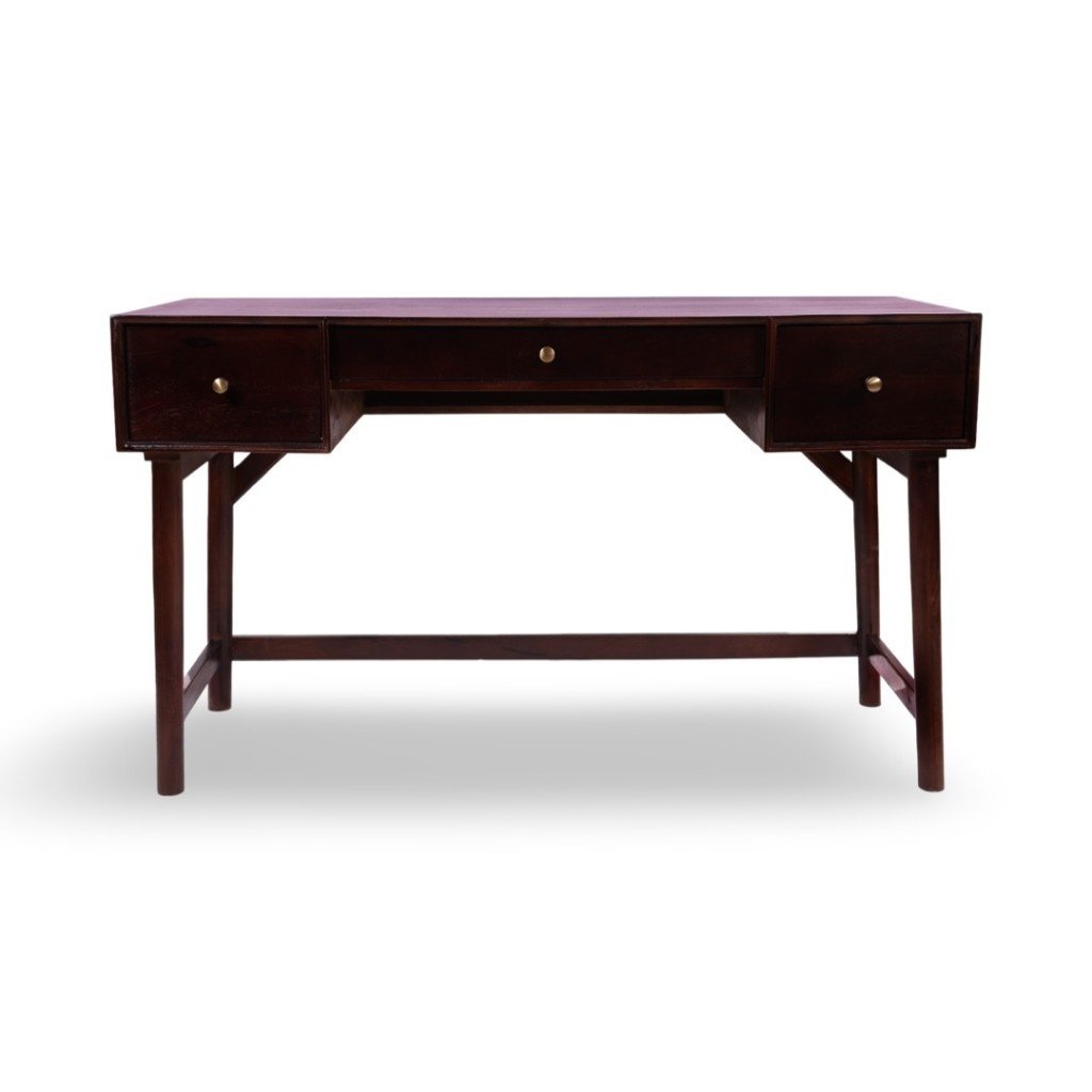 Designed with a clean, minimalist profile, Mocharve features a spacious rectangular tabletop that comfortably accommodates laptops, books, and writing essentials. In addition, three well-proportioned drawers—two on the sides and one centrally placed—help keep your workspace organized and clutter-free. The brass-toned round knobs introduce a subtle contrast, while the sturdy tapered legs ensure long-lasting stability.