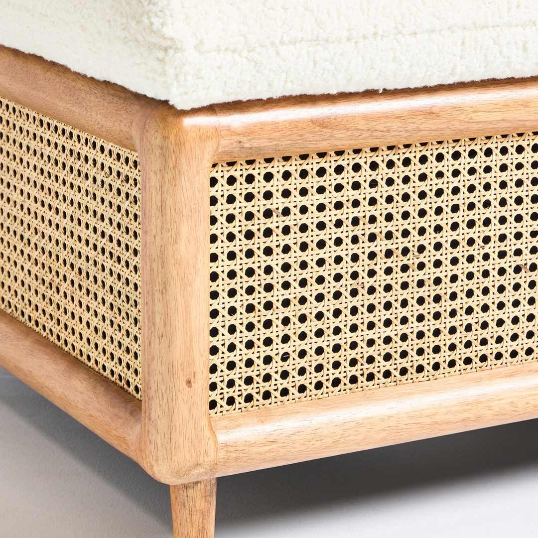 Square shape, cane webbing (rattan) sides, tapered legs, lift-top lid with sherpa fabric upholstery, internal storage compartment |