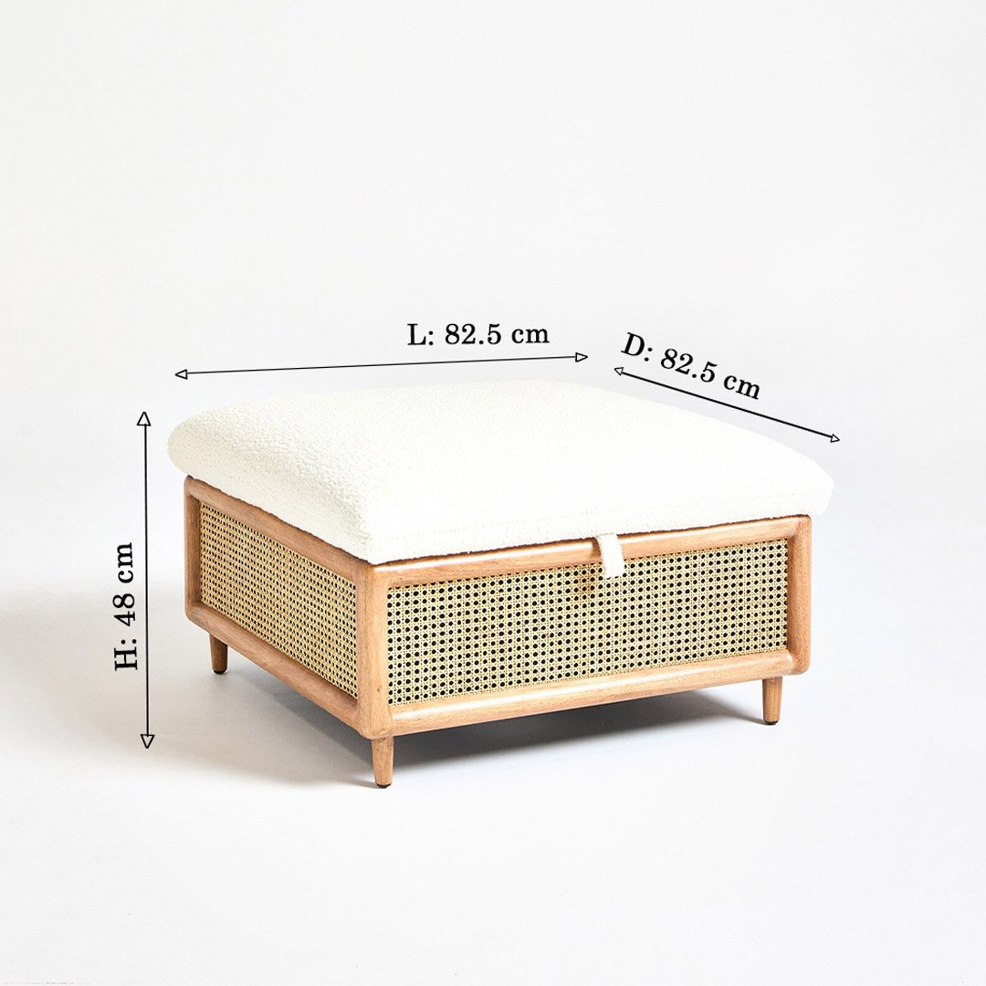 The Mora Rattan Storage Ottoman is a versatile and stylish addition to any home. Handcrafted from premium Mango wood by skilled artisans at Wooden Slice, it features intricately woven natural rattan (cane) sides. These add texture, warmth, and charm to your living space.