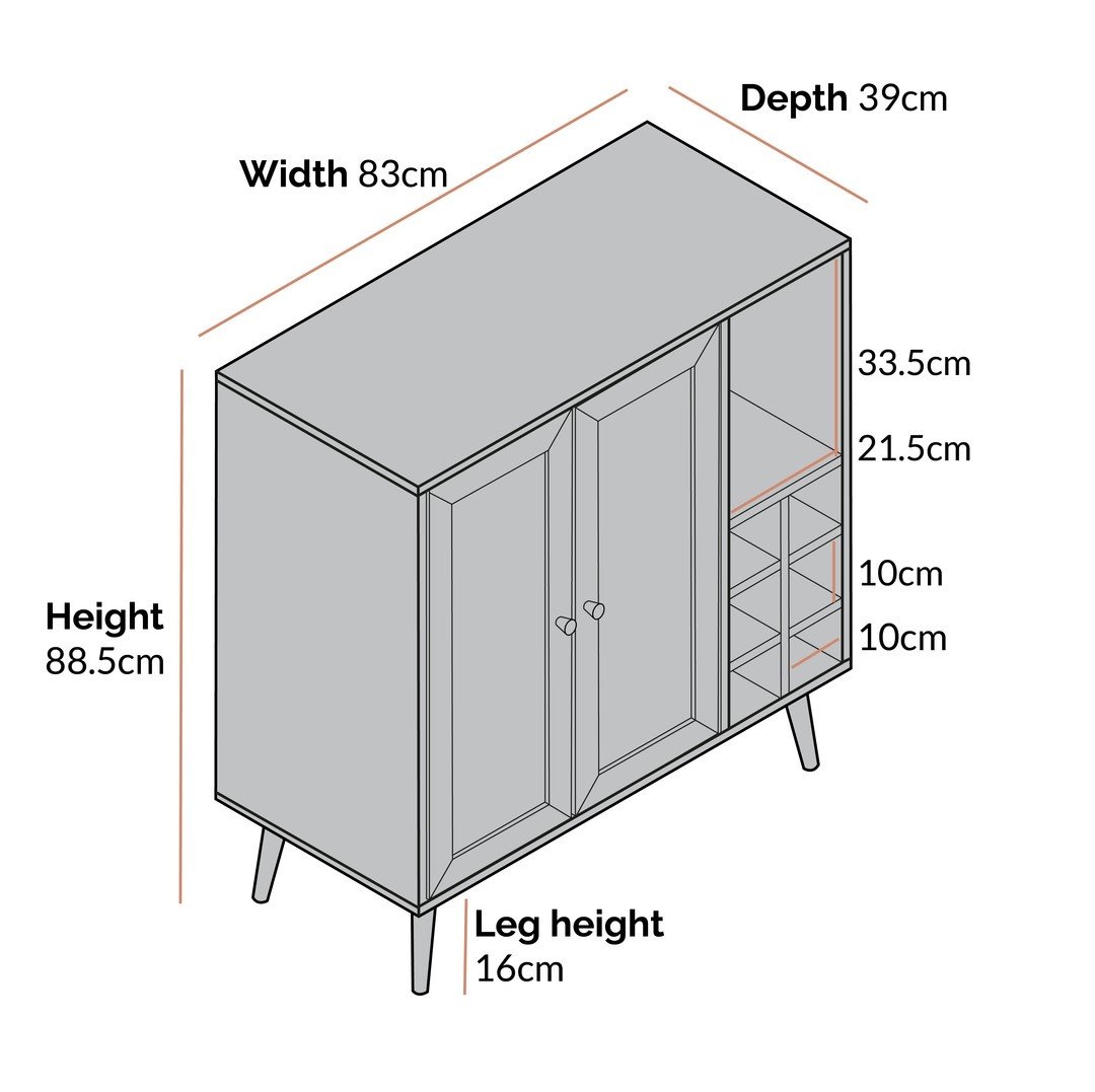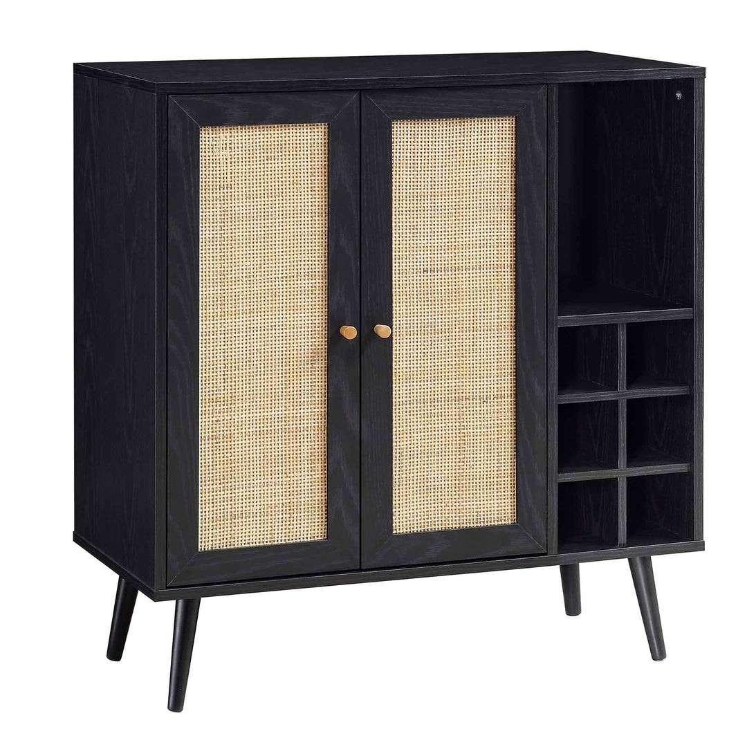 Functionally, this cane bar unit includes a built-in wine rack for bottle storage. It also offers an open display shelf for décor or frequently used glassware. Furthermore, the spacious dual-door compartments help organize bar tools, bottles, and accessories with ease.
