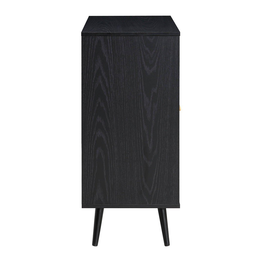 Rich black Sheesham wood finish with handwoven cane doors. |
