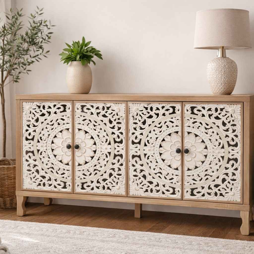 This handcarved sheesham wood console features spacious internal storage behind beautifully carved doors. It helps keep your space organized while maintaining a clean and refined appearance. The wide tabletop provides ample space for décor, lamps, mirrors, or curated accents.