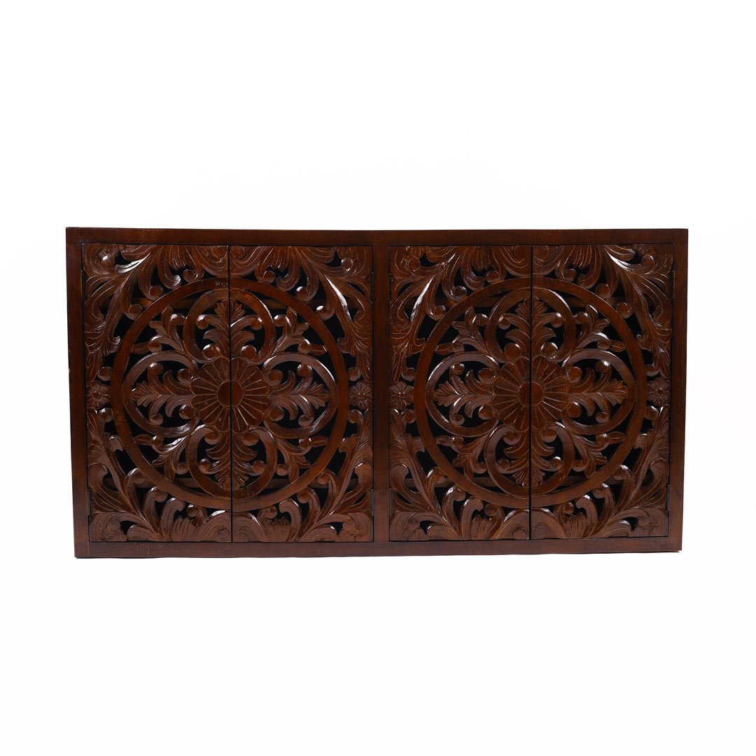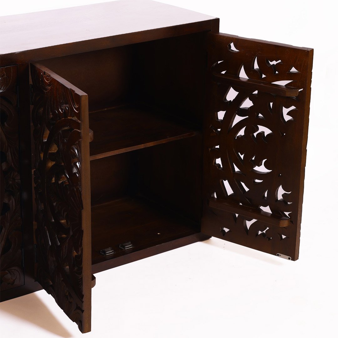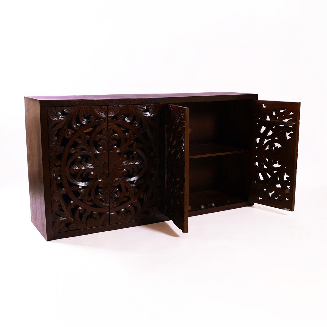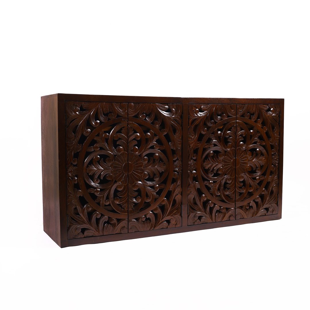 This handcrafted wooden sideboard features four ornate doors with detailed floral and mandala carvings. Indian architectural patterns inspire the design, giving the piece cultural depth and visual richness. Skilled artisans carve every motif by hand, which makes the Nuttiera not just practical but also a true piece of art.