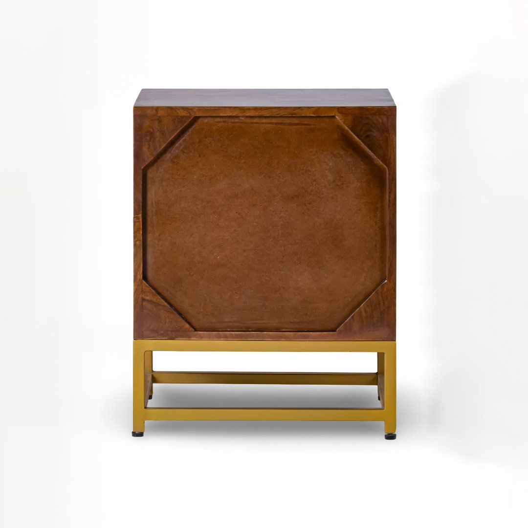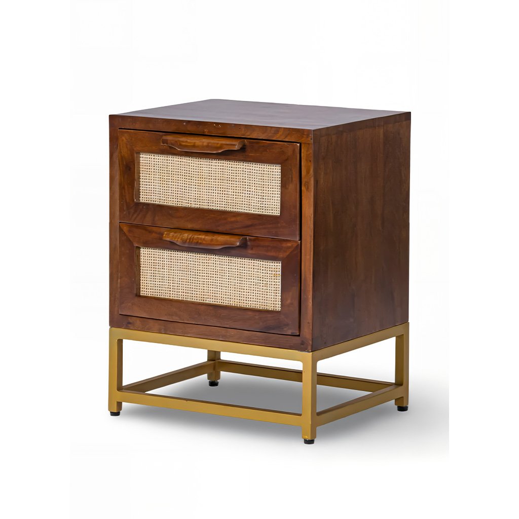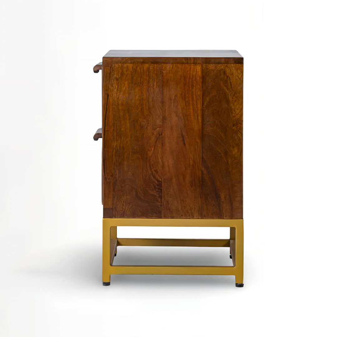 Designed for both style and storage, this mango wood bedside table features two spacious drawers with integrated wooden pulls for a clean, seamless look. The sturdy gold-finish metal base provides excellent stability while adding a refined modern contrast to the natural materials.