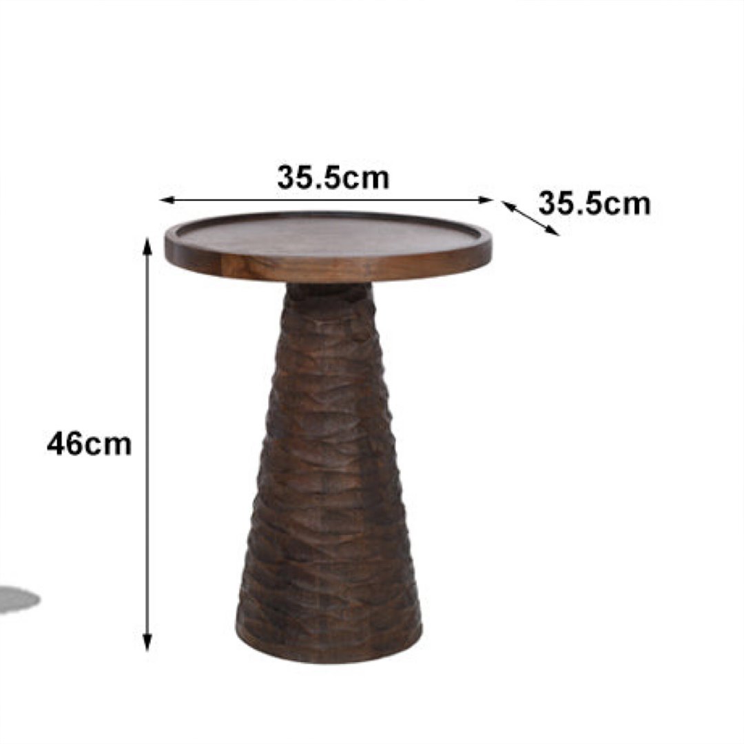 Ravilo, a handcrafted wooden end and side table from Wooden Slice, beautifully combines rustic charm with artistic craftsmanship. This elegant accent piece features a finely carved conical base and a smooth, round top, offering both visual texture and timeless appeal.