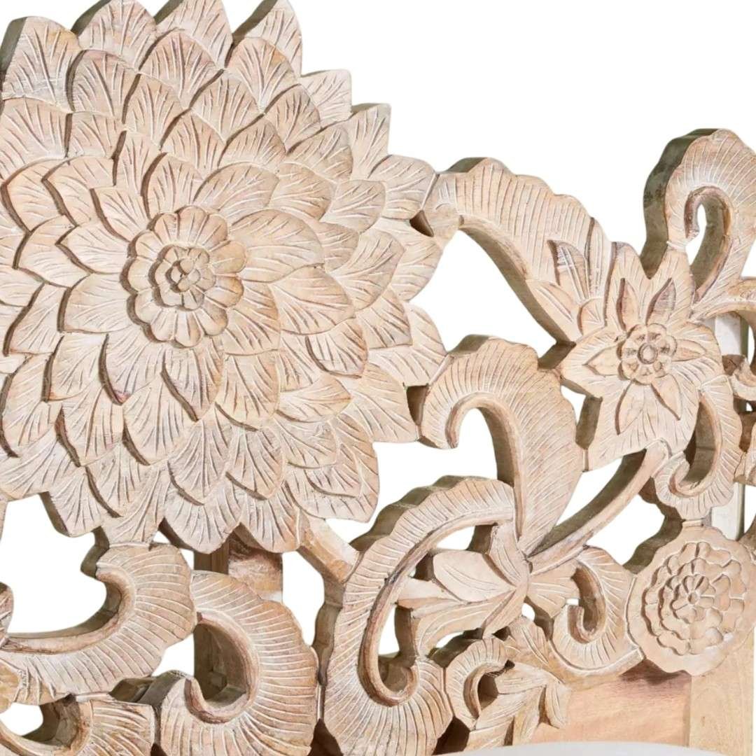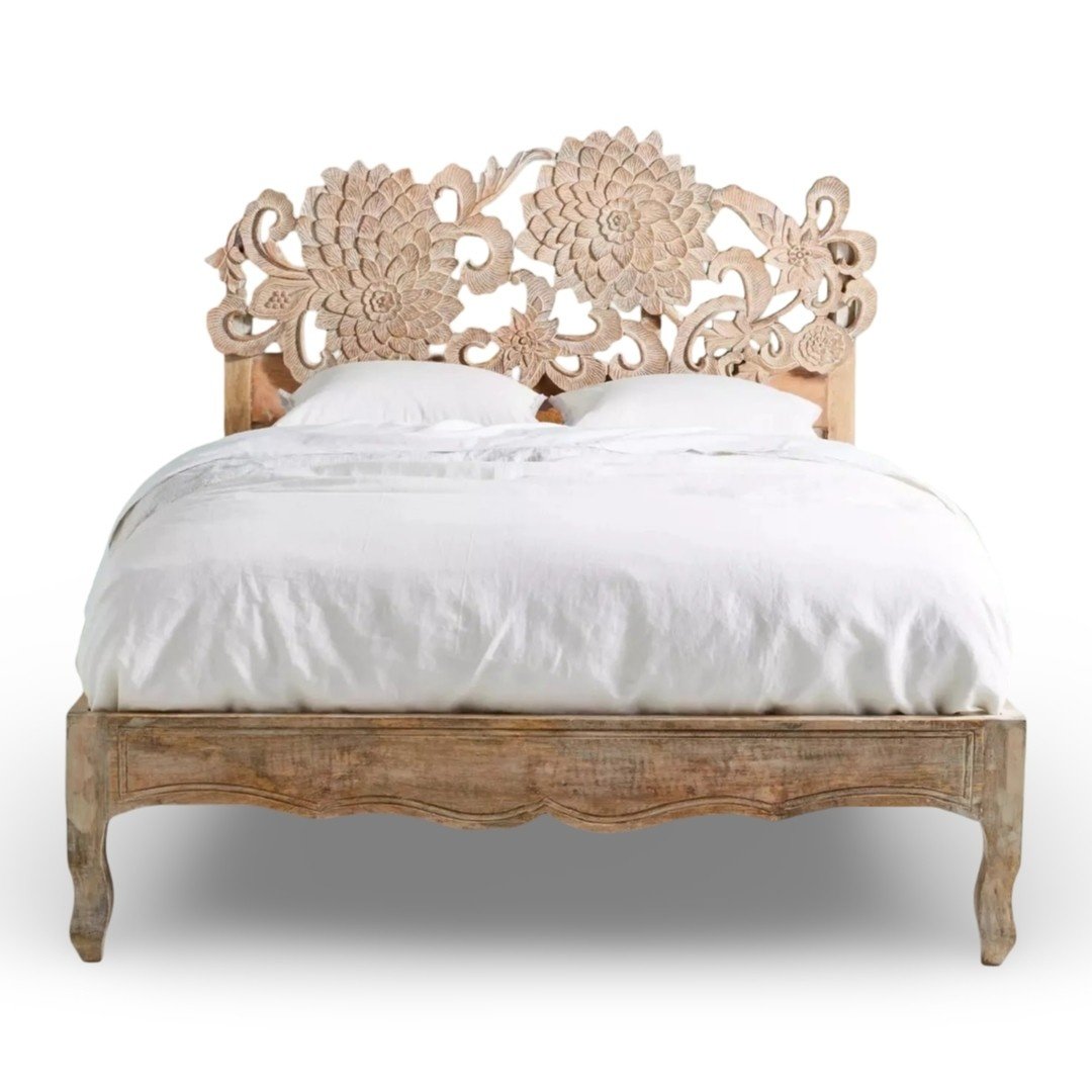 Intricate floral hand-carved headboard |