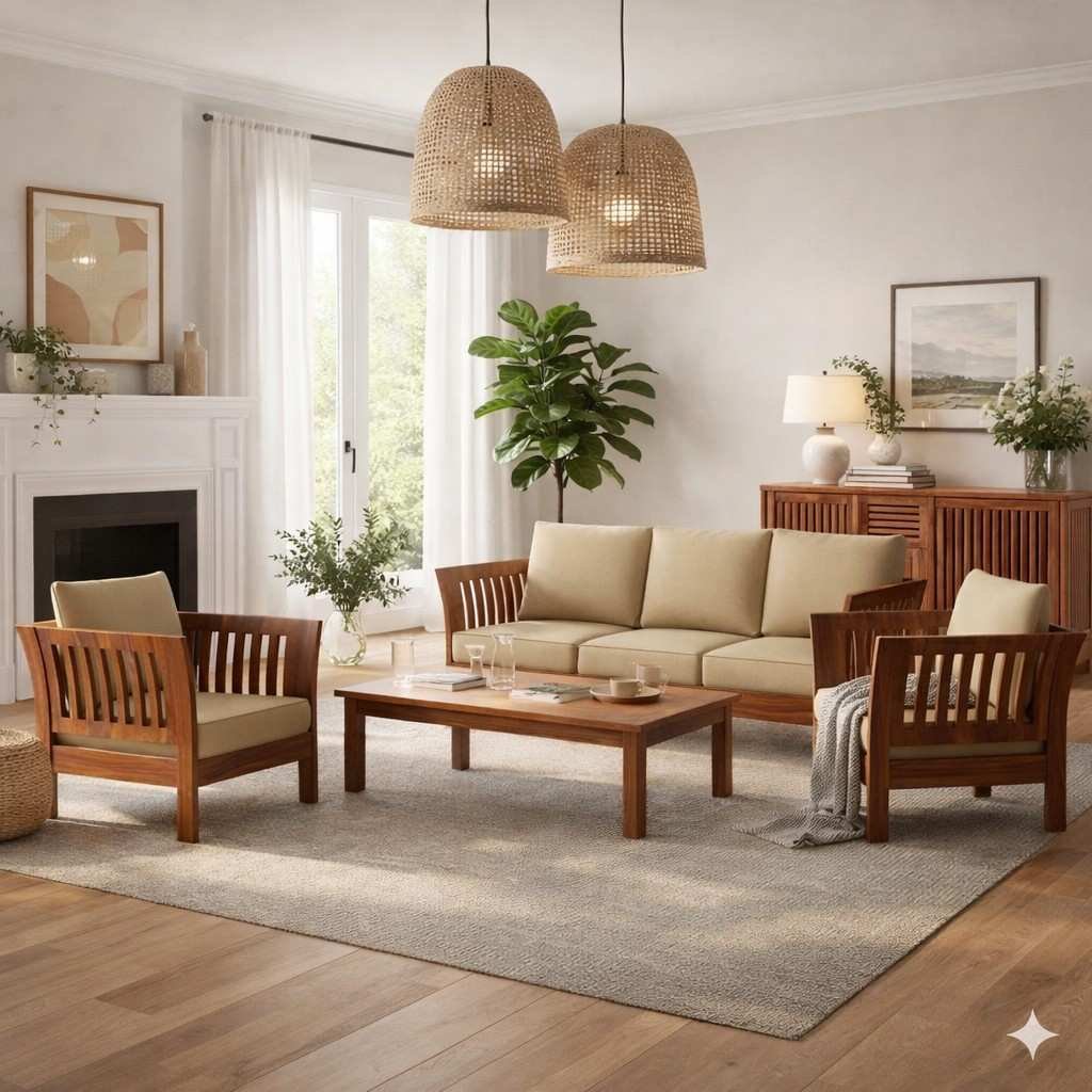 The curved slatted armrests and clean-lined frame create a modern yet classic look. Therefore, it suits contemporary, traditional, and minimal décor styles. Built with a sturdy solid wood structure, this solid wood 5-seater sofa ensures long-lasting strength. In addition, the high-density foam cushions provide superior comfort for daily use and guest seating.