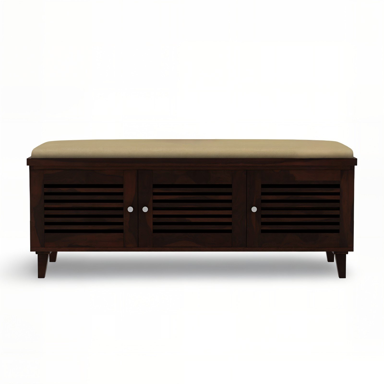 The bench highlights a rich walnut brown finish that beautifully contrasts with the cream upholstered seat. Moreover, its silver metal knobs and louvered doors add sophistication while allowing air circulation to keep your shoes fresh. Inside, spacious compartments neatly store multiple pairs of shoes and daily essentials.