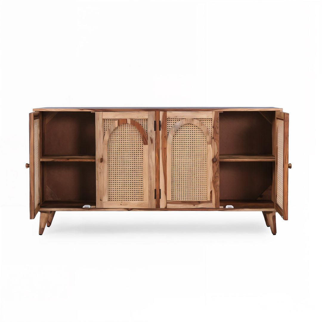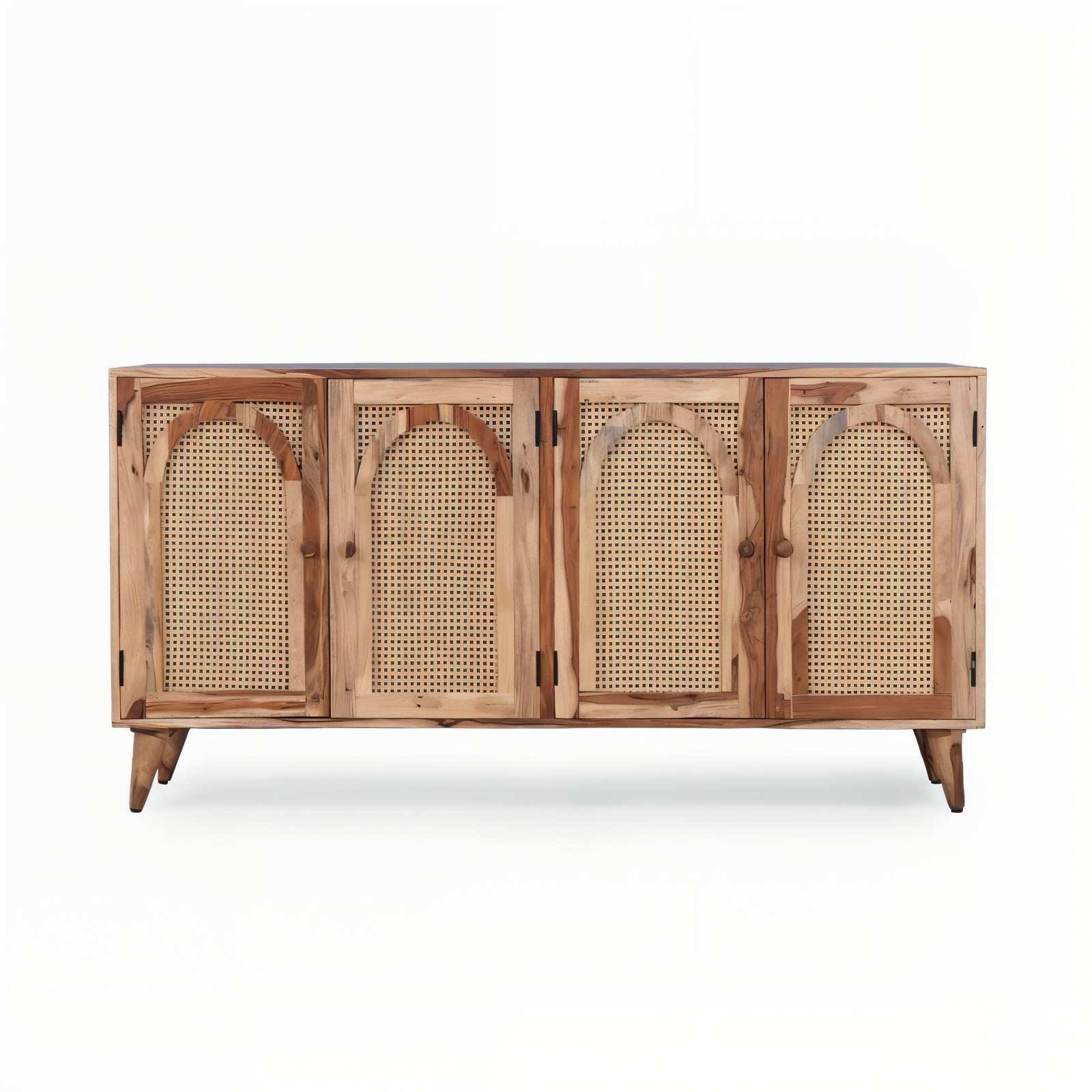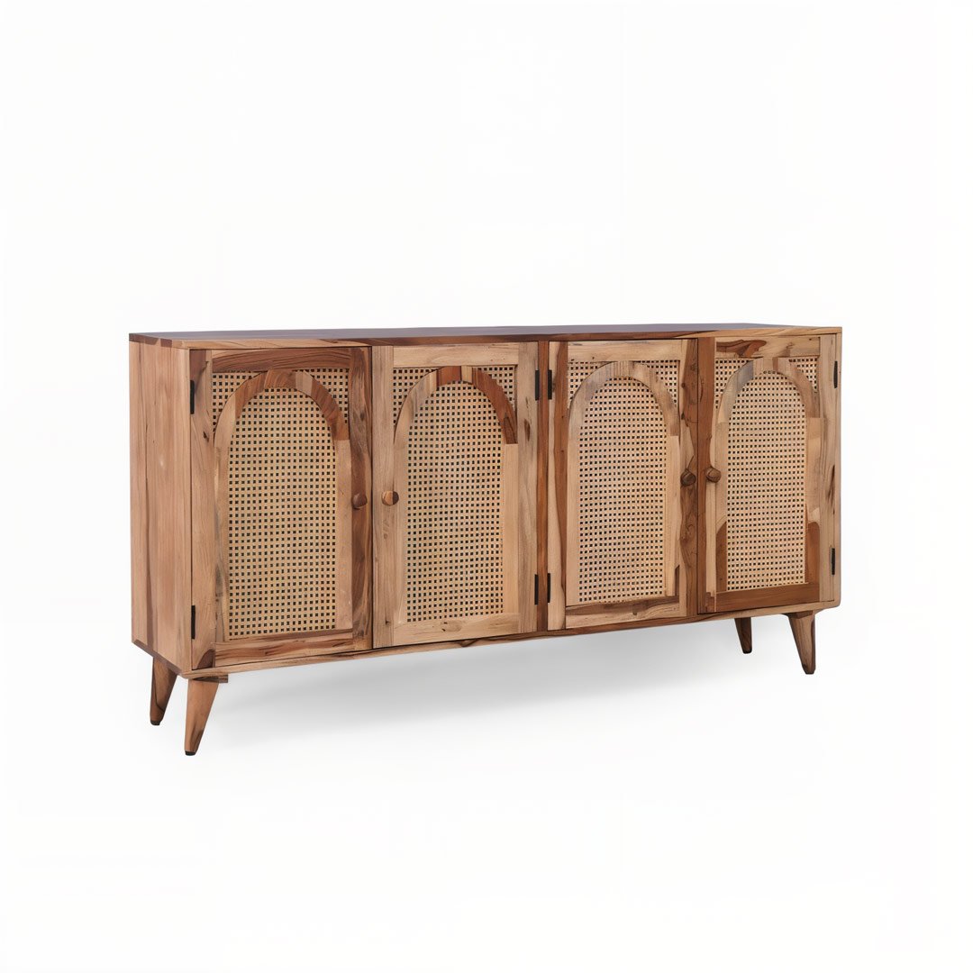 This sideboard features four spacious compartments with internal shelves, giving you practical storage for dining ware, electronics, books, or everyday items. The arched cane doors allow airflow while keeping belongings neatly hidden. In addition, the tapered wooden legs lift the cabinet visually, adding a refined mid-century touch.