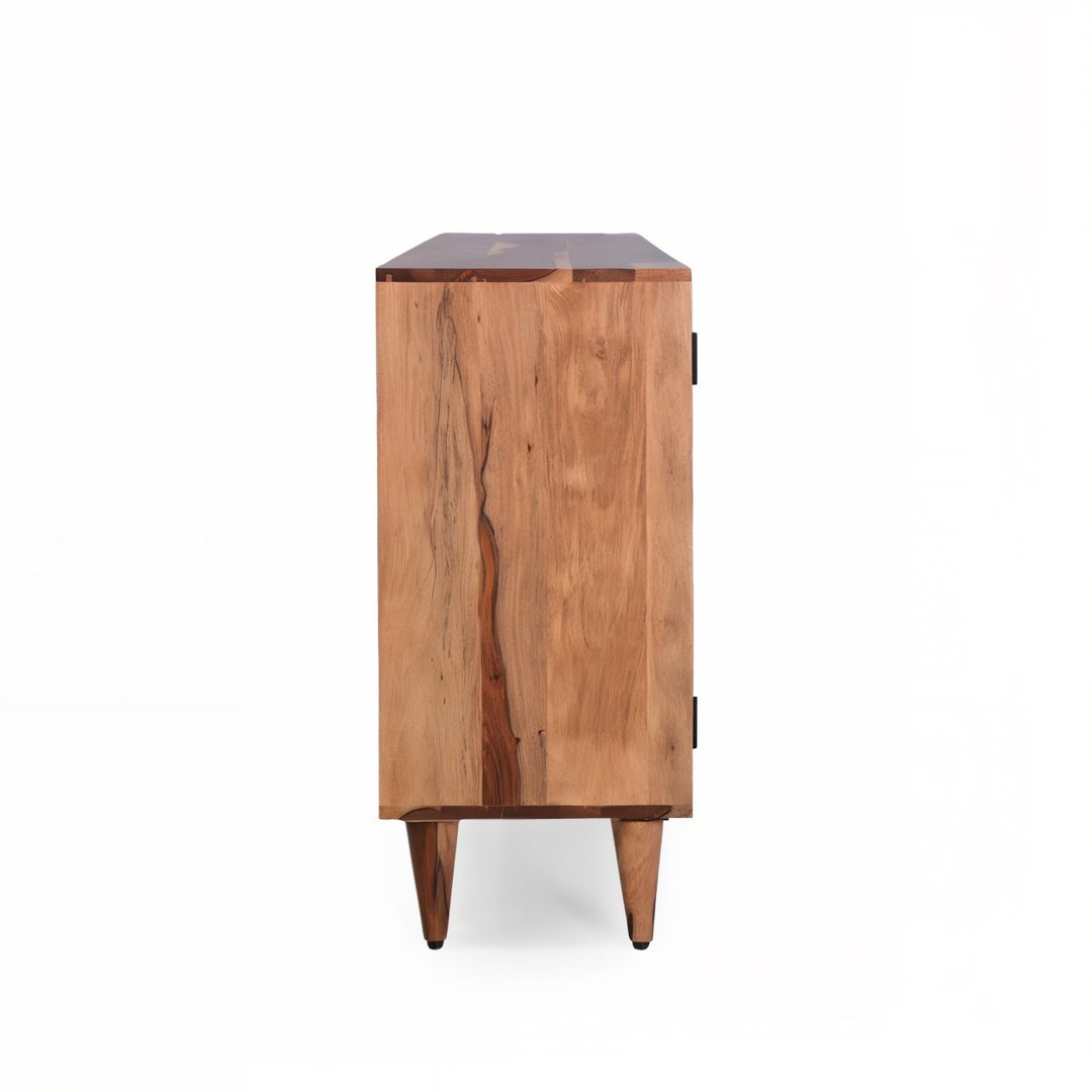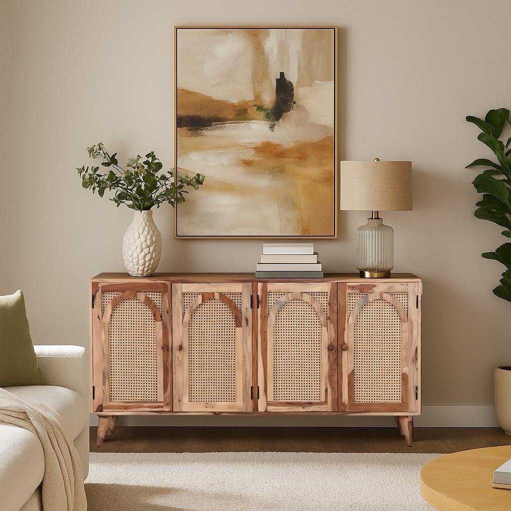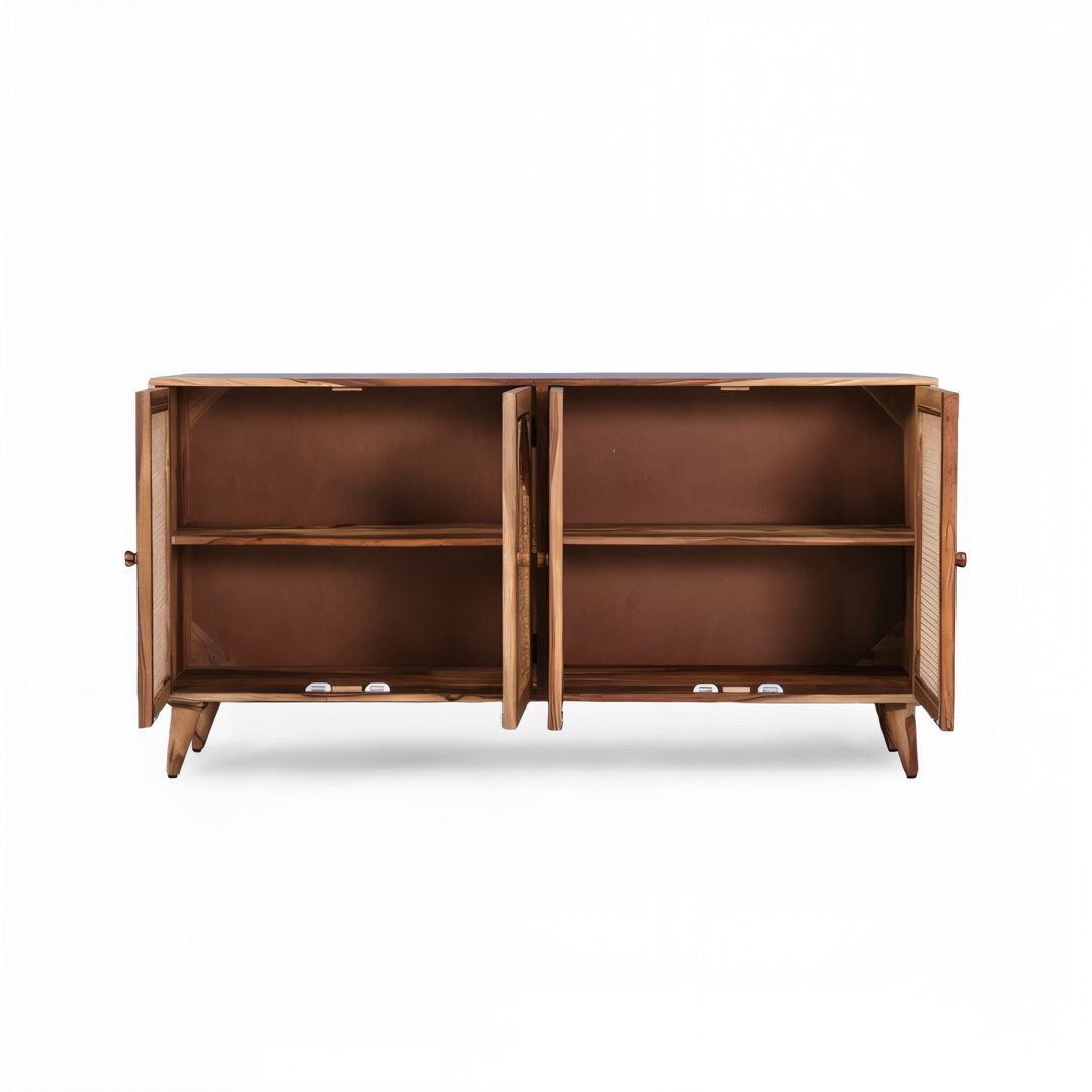 This sideboard features four spacious compartments with internal shelves, giving you practical storage for dining ware, electronics, books, or everyday items. The arched cane doors allow airflow while keeping belongings neatly hidden. In addition, the tapered wooden legs lift the cabinet visually, adding a refined mid-century touch.