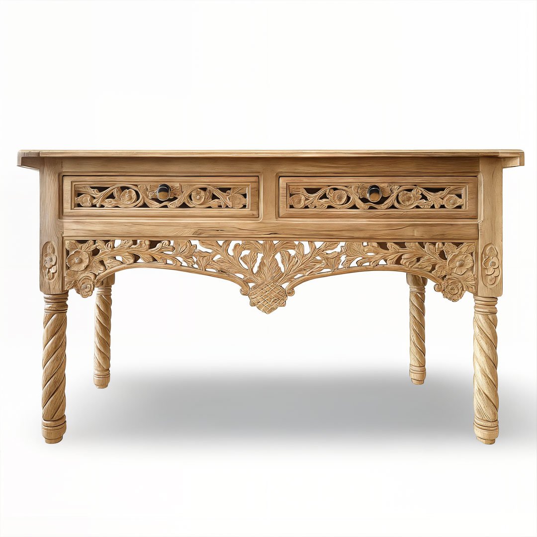 Each Wooden Console Table is skillfully made by artisans who carve delicate floral and leaf patterns across the apron and drawers. The spiral-carved legs enhance its graceful charm, while the two drawers offer convenient storage for essentials. With its sturdy build and smooth finish, this handcrafted table perfectly balances style and function.