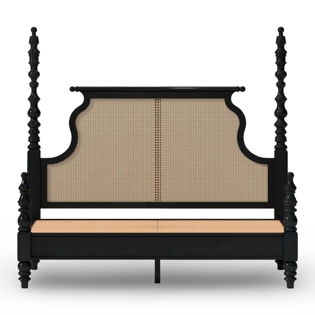 Firstly, skilled artisans shape the tall poster frame using traditional turning techniques. They then weave natural cane into the headboard to create a breathable and elegant panel. As a result, the bed feels grand yet inviting. Moreover, the rich black finish highlights the contrast between the solid wood structure and the natural cane weave.