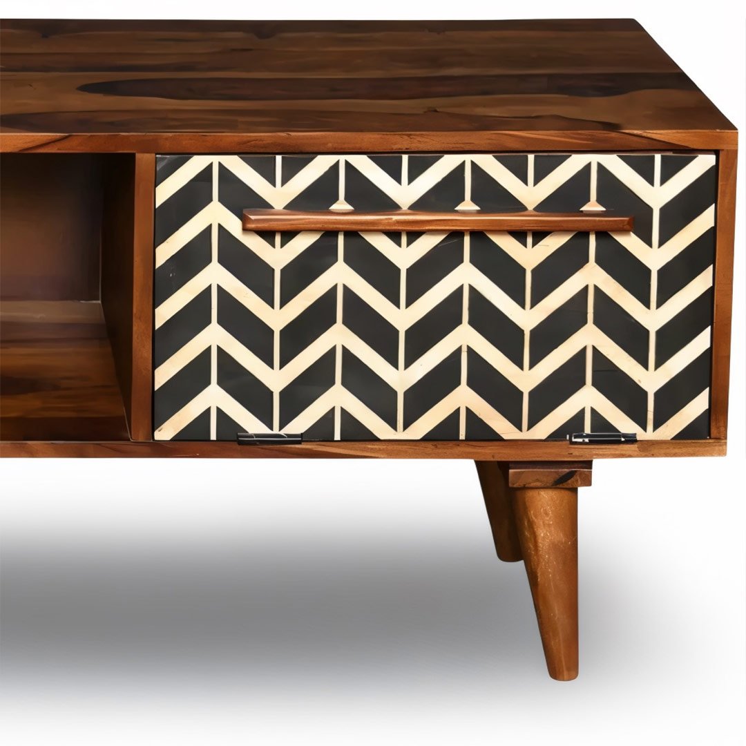 The highlight of this sheesham wood TV unit is its monochrome chevron bone inlay pattern. The bold geometric motif adds visual depth and elevates the piece from simple furniture to handcrafted décor. Each inlay is placed by hand, ensuring a refined and authentic artisanal look.
