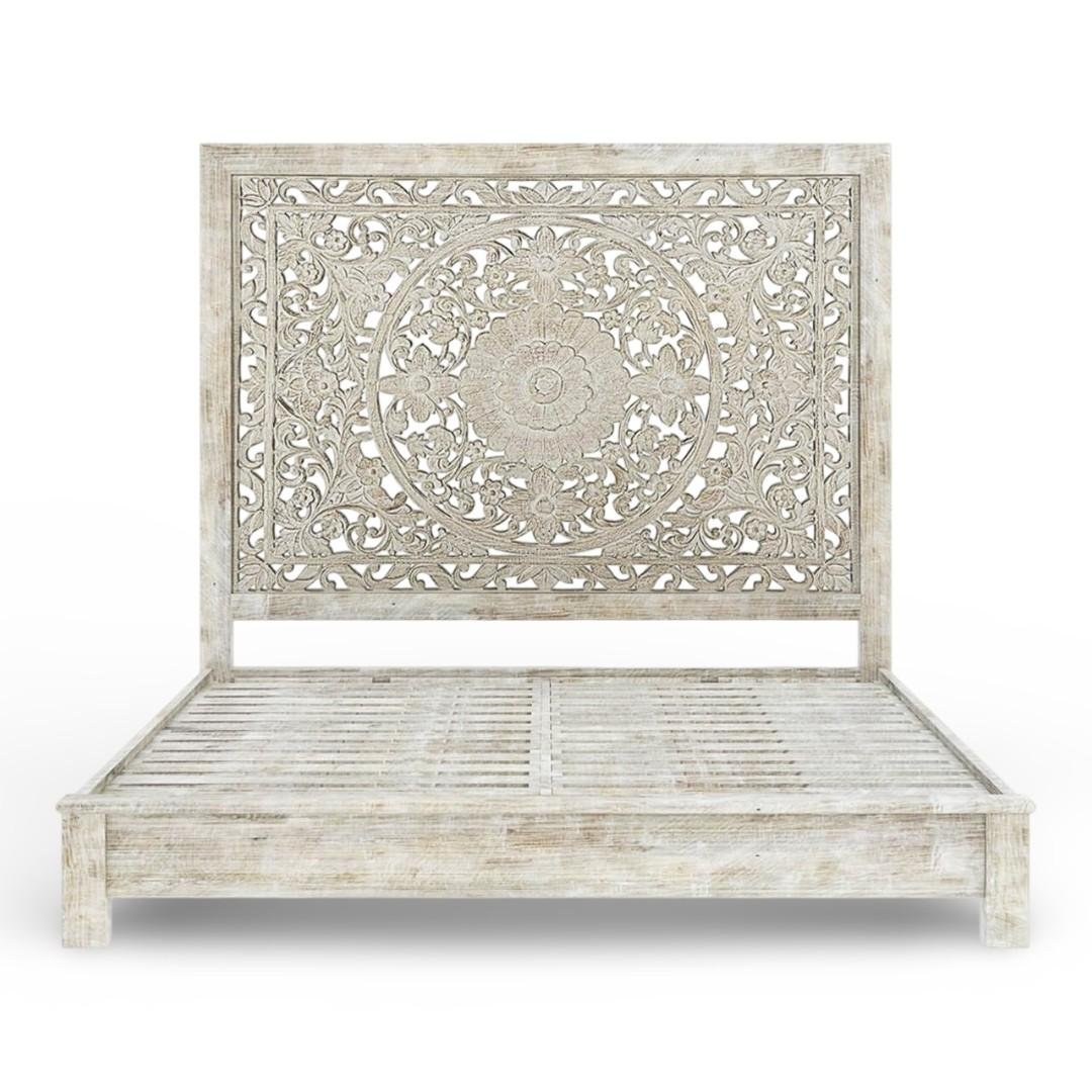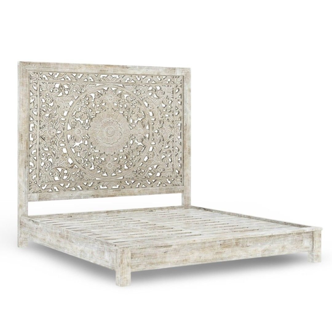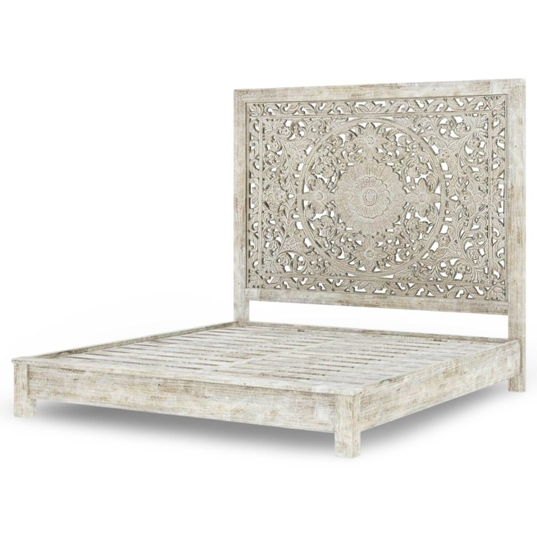 The standout feature of this handcrafted white bed is its beautifully carved headboard. Skilled artisans carefully hand-carve floral and heritage-inspired motifs into the solid wood. As a result, the headboard becomes a striking focal point. Moreover, the white distressed finish highlights every carved detail while revealing subtle hints of natural wood grain.