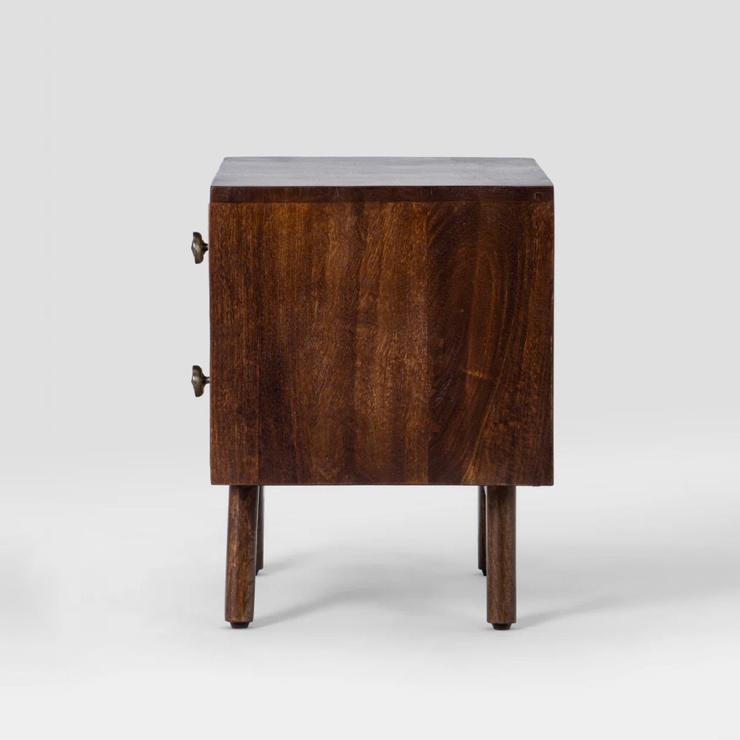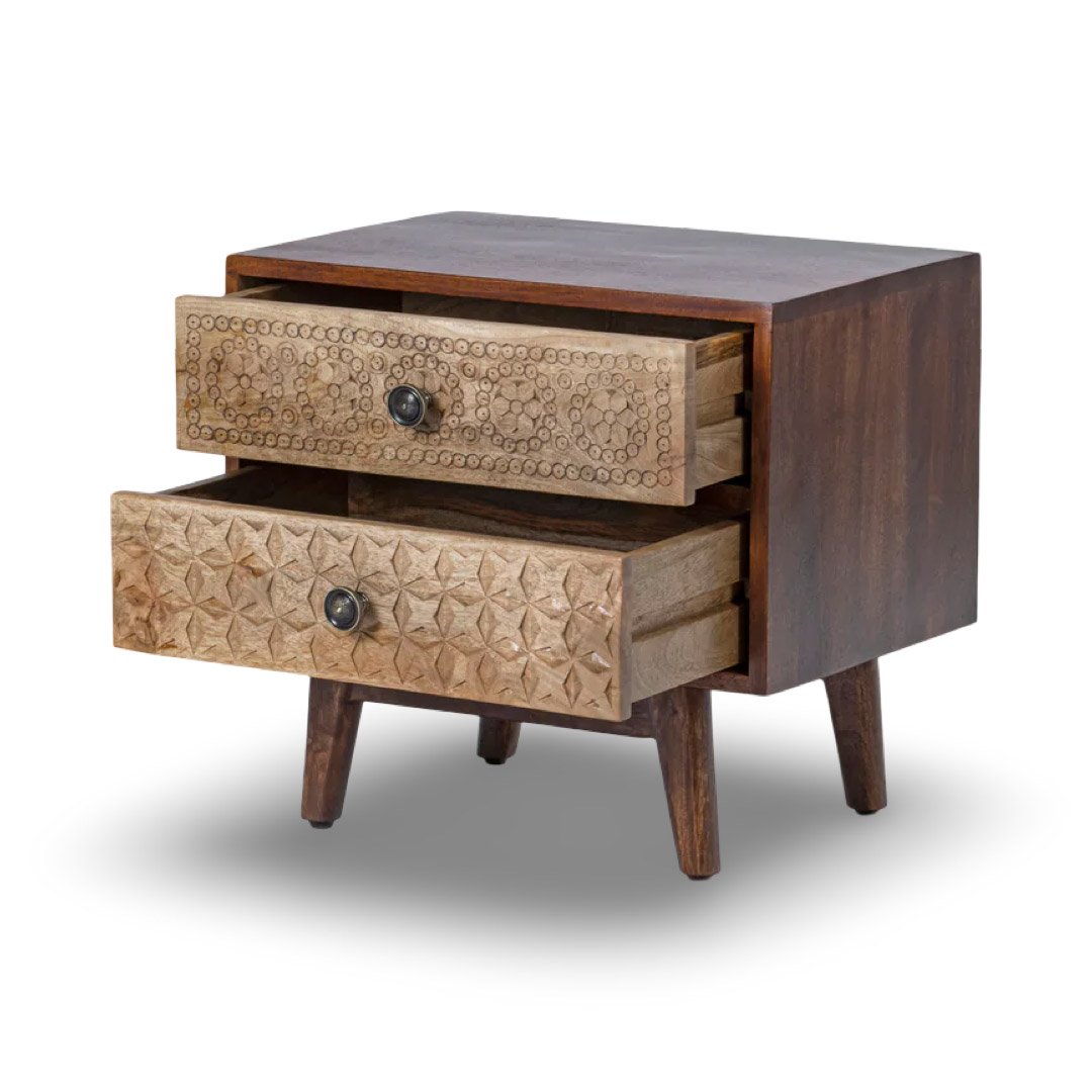 This handcrafted mango wood bedside table features two smooth-glide drawers with distinct hand-carved patterns, offering practical storage for books, chargers, and bedtime essentials. Metal knobs add a subtle contrast, while tapered wooden legs provide stability and a refined silhouette.